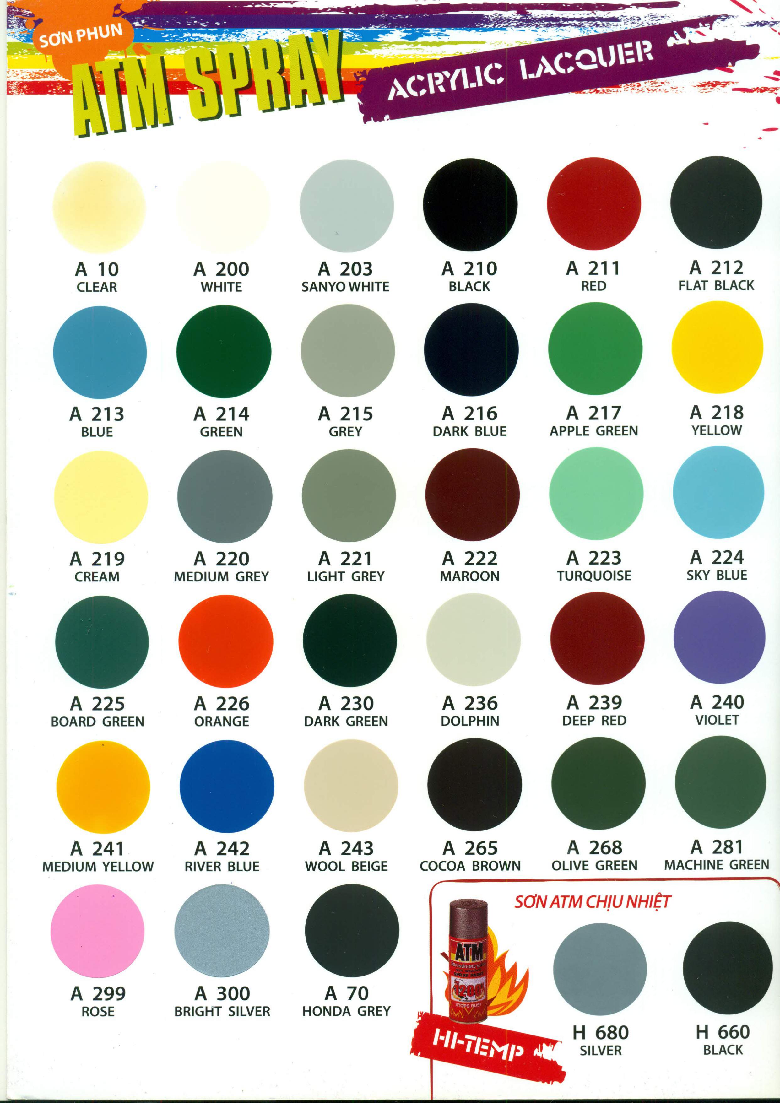 SƠN PHUN “ATM” ACRYLIC: Đặc chế từ hỗn hợp nhựa N/C và ACRYLIC, được đóng gói dưới dạng bình xịt cầm tay rất tiện dụng, dùng sơn để trang trí cho các bề mặt bằng