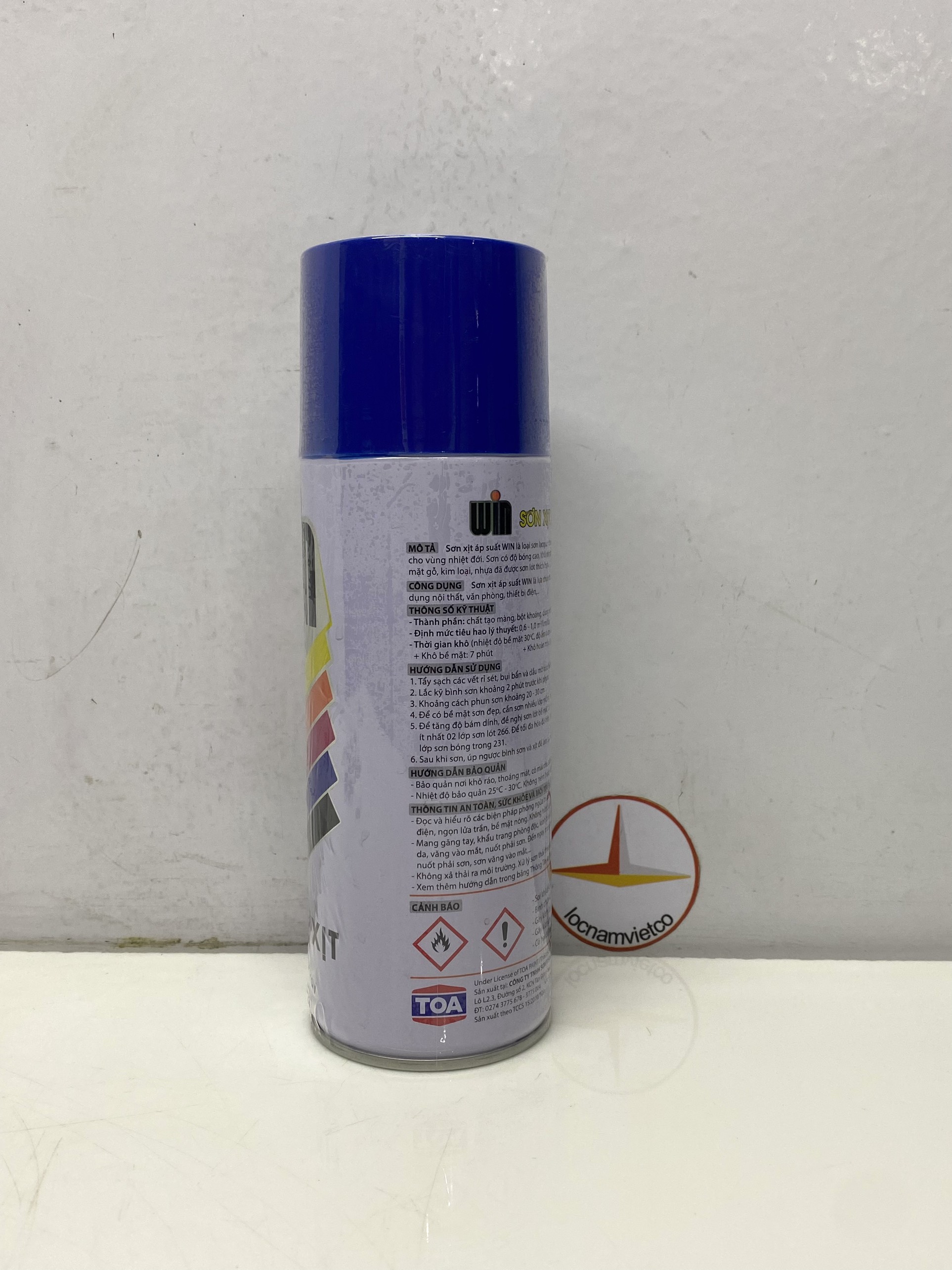 - Khô hoàn toàn:Sau 1 giờ Một số mã màu sơn xịt Win khác: Clear 231(Không màu); màu trắng white 200; màu bạc bright silver; màu đỏ 211 red; màu đen mờ flat black 212; màu đen black 210; màu xanh 224 sky blue; màu xanh 213; màu xanh river blue 242; màu xanh ford tractor blue 238; màu xanh đen dark blue 216; màu tím 240 violet; turquoise 223; màu xanh apple green 217; màu xanh green 214; màu black board green 225; machine green 281; olive green 268; màu kem 219 cream; màu vàng yellow 218; màu vàng medium yellow 241 màu cam 226 orange; màu hồng pink 229; màu xanh đen dark green 230; màu trắng xám 232; màu xám kusota 958; màu xám grey 215; màu xám sáng light grey 221; màu xám medium grey 220; màu nâu cocoa brown 265; màu đỏ deep red 239; màu maroon new 222; màu grey A70 Sơn xe mô tô, xe máy, xe đạp WIN: Màu mêta đỏ candy red 236; màu meta xanh wave green A007; màu meta xanh dương candy blue 235; Màu nho dream H012; Sơn nhũ bạc meta hat nhỏ undercoat silver A100; sơn nhũ bạc mê ta hạt lớn candy tone 404 màu candy green 234; màu mêta đồng gold 228. Sơn xịt màu đặc biệt: Màu xi mạ vàng K83 Pearl gold Sơn xịt chịu nhiệt(600 độ C/ 1200 độ F): Sơn chịu nhiệt đen mờ H51, sơn chịu nhiệt bạc sáng H52 Sơn lót chống rỉ: Sơn lót màu xám primer surfacer grey 266; sơn lót chống rỉ màu đỏ chu Anti-rust primer 267. HƯỚNG DẪN THI CÔNG: