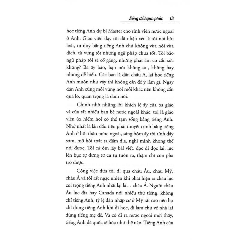 Mua tại TiktokSống Để Hạnh Phúc Cuốn sách là một chuỗi những cuộc trò chuyện giản dị của cô Nguyễn Hoàng Ánh về nỗi bất an của xã hội này: Trăn trở làm người, tìm ra được giá trị của bản thân, và mục đích chúng ta sống! Đây là những chia sẻ hết sức hữu ích dành cho các bạn trẻ và bậc làm cha mẹ, giúp chúng ta trả lời các câu hỏi: -Có nên học trường chuyên? -Chúng ta có thực sự đặc biệt không? -Thế nào là học giỏi, thế nào là thành công? -Làm giáo viên sướng hay khổ? -Vì sao đi du học? -Con cái chúng ta có thực sự có quyền sống hay không? Ta mong đợi và gửi gắm rất nhiều vào giáo dục Việt Nam, nhưng chúng ta cũng buộc phải tìm cách tự trả lời những câu hỏi trước cánh cửa cuộc đời. Du học, bằng cấp, niềm say mê, ước mơ trên ghế giảng đường, cuộc sống náo nhiệt từ Face book và tâm hồn cô quạnh của giới trẻ… Mỗi bài viết trong Born to be happy đều có khả năng khơi gợi bạn tự tìm ra nhiều cách trả lời khác nhau cho cuộc sống phía trước! Tác giả Nguyễn Hoàng Ánh kêu gọi giới trẻ ước mơ, và băn khoăn về những vị phụ huynh mãi không chịu trưởng thành. Cuộc sống học đường trong cuốn sách thực ra là một hành trình tự định vị bản thân, dũng cảm trải nghiệm sống, không ngừng mơ ước của tác giả. Tác giả Nguyễn Hoàng Ánh được hàng chục ngàn sinh viên ĐH Ngoại Thương yêu quý, cũng là người dẫn dắt, tạo cảm hứng, khích lệ rất nhiều bạn trẻ vững tin vào cách mình sống và mình cống hiến. Đọc sách và dũng cảm lên, vì chúng ta vốn sinh ra để sống hạnh phúc! (Nhà văn Trang Hạ) Tên Nhà Cung Cấp Alpha Books Tác giả Nguyễn Hoàng Ánh NXB NXB Hồng Đức Năm XB 02-2017 Số trang 220 Hình thức Bìa Mềm Sản phẩm bán chạy nhất Top 100 sản phẩm Kỹ năng sống bán chạy của tháng