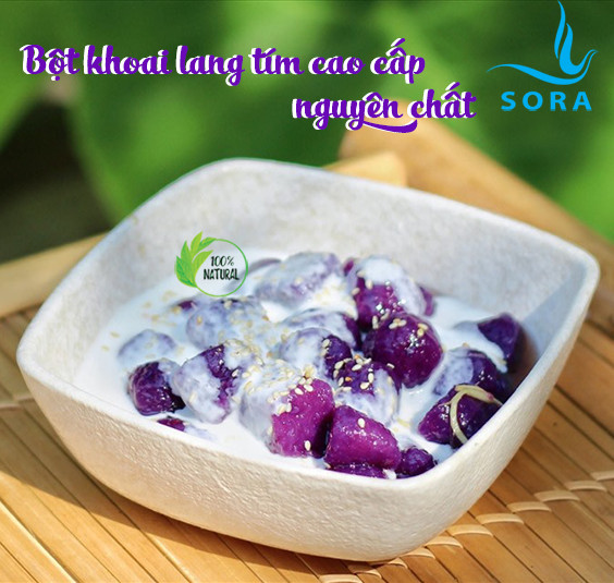 Với màu sắc bắt mắt và hương vị thơm ngon, khoai lang tím trở thành món ăn dân dã của nhiều gia đình. Đây là thực phẩm có nguồn gốc từ Nam Mỹ, họ hàng xa với cây khoai mỡ và khoai tây.Khoai lang tím giàu kali, tinh bột, axit amin, vitamin, chất xơ, nhiều nguyên tố vi lượng nên có nhiều lợi ích về mặt sức khỏe.      Khoai lang tím trở thành món ăn dân dã của nhiều gia đình.Khoai lang tím, có phần “thịt” màu tím mờ đến tím sẫm, rất giàu protein, 18 loại axit amin tốt cho tiêu hóa, 8 loại vitamin A, B,C và phốt pho, sắt cùng với hơn 10 loại hóa chất tự nhiên khác.    Khoai lang tím lâu nay được biết rất có ích trong việc giúp cơ thể chống lại sự mệt mỏi và tốt cho máu, có thể thúc đẩy quá trình thải độ, cải thiện hệ tiêu hóa, phòng ngừa các bệnh dạ dày và đường ruột, ngừa bệnh ung thư. Và trong nghiên cứu trên của các nhà khoa học Mỹ, khoai lang tím còn được phát hiện ra rằng có khả năng tiêu diệt và ngăn chặn được các tế bào ung thư lây lan.    Sora bột khoai lang tím cao cấp nguyên chất là sản phẩm được sản xuất với công nghệ và quy trình hiện đại, mang đến cho người tiêu dùng sản phẩm sạch, chất lương, an toàn và hợp vệ sinh, không tạp chất, không chất bảo quản, không hương liệu, phẩm màu. Bột khoai lang tím Sora có màu từ tím nhạt đến tím đậm tùy theo tư từng đợt khoai và mùa vụ.