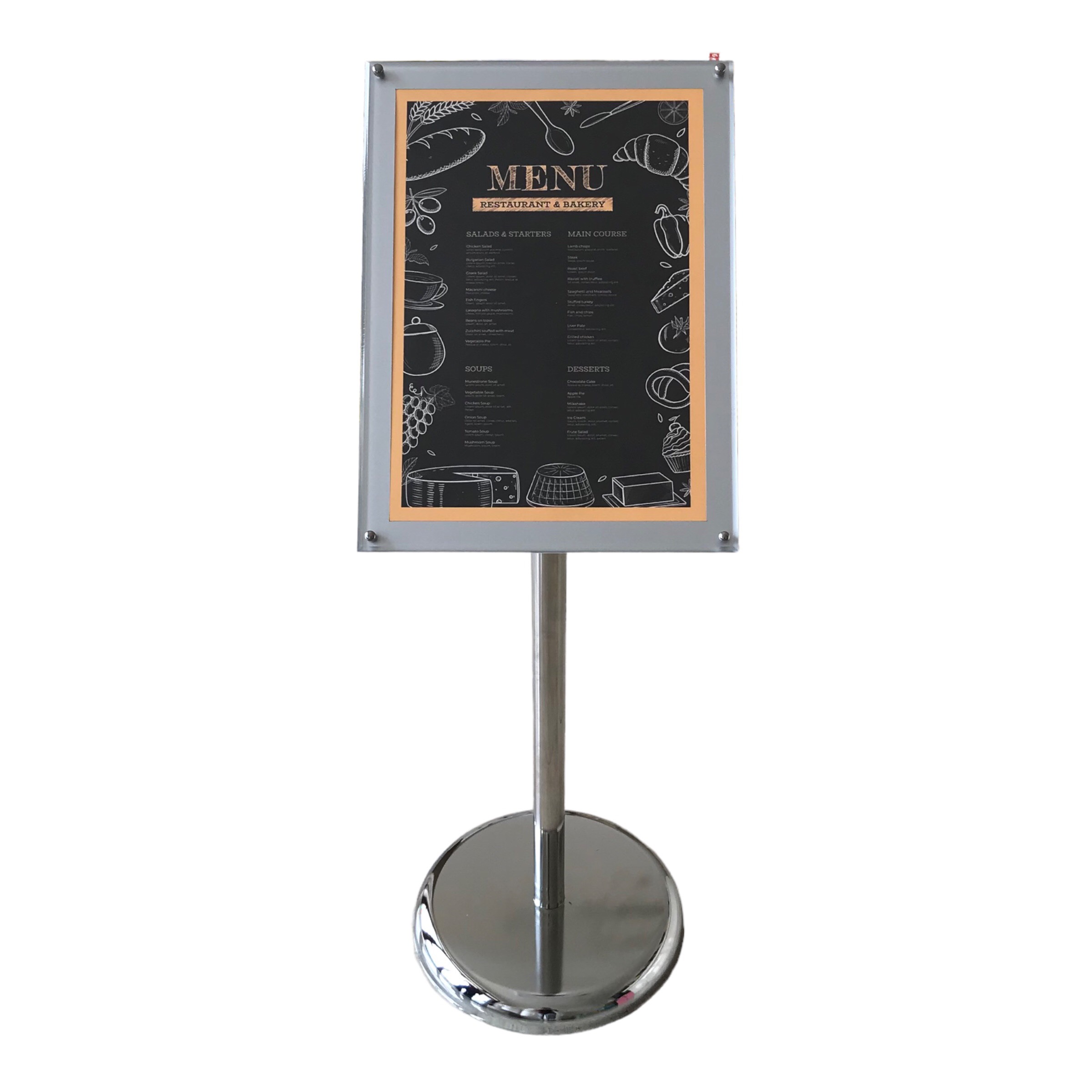 Standee trụ inox khung mica A4 Quy cách: Mặt bảng bỏ vừa giấy A4
