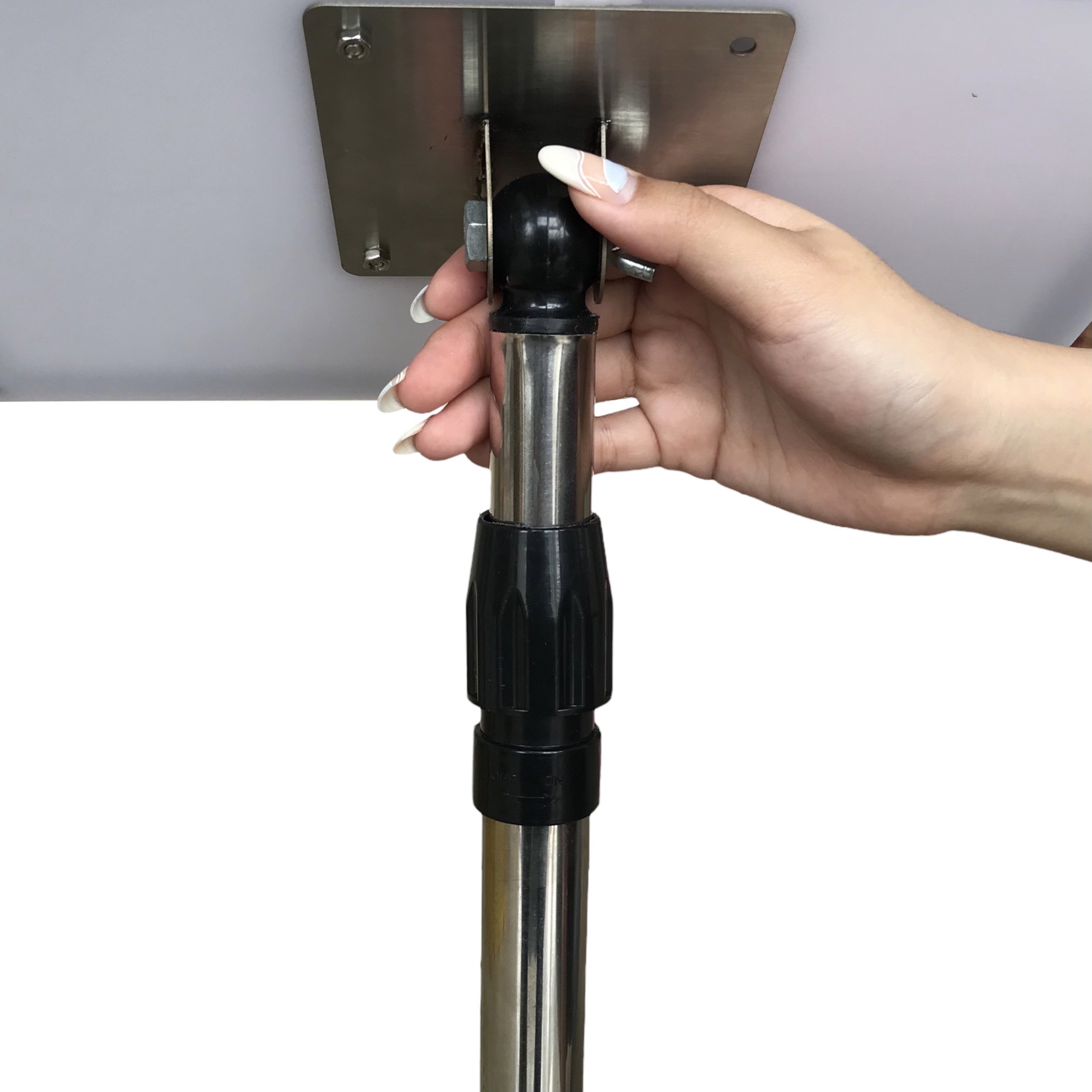 Trụ inox khung mica bền đẹp có thể tháo rời các bộ phận để di chuyển. Mặt bảng có kích thước A4 có thể xoay 360 độ. Độ cao của standee trụ inox khung nhôm A4 có thể điều chỉnh được điều chỉnh được từ 72cm đến 125 cm. Bốn cạnh xung quanh standee có thể lật lên, lật xuống dễ dàng khi cần thay đổi menu.