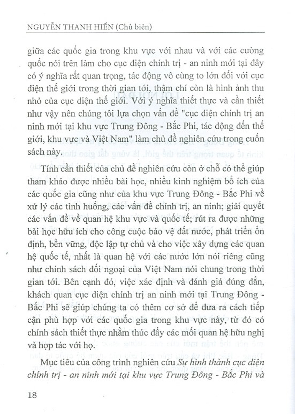 Mục tiêu của công trình Sự hình thành cục diện chính trị - an ninh mới tại khu vực Trung Đông – Bắc Phi và tác động là xác định và nghiên cứu cụ diện chính trị - an ninh mới đang được hình thành tại khu vực Trung Đông – Bắc Phi, nghiên cứu tác động của nó đến khu vực, thế giới và Việt Nam; rút ra một số bài học kinh nghiệm về xử lý những vấn đề chính rị - an ninh và quan hệ quốc tế cùng một số khuyến nghị nhằm thúc đẩy quan hệ hợp tác giữa Việt Nam với khu vực Trung Đông – Bắc Phi trong bối cảnh mới.
