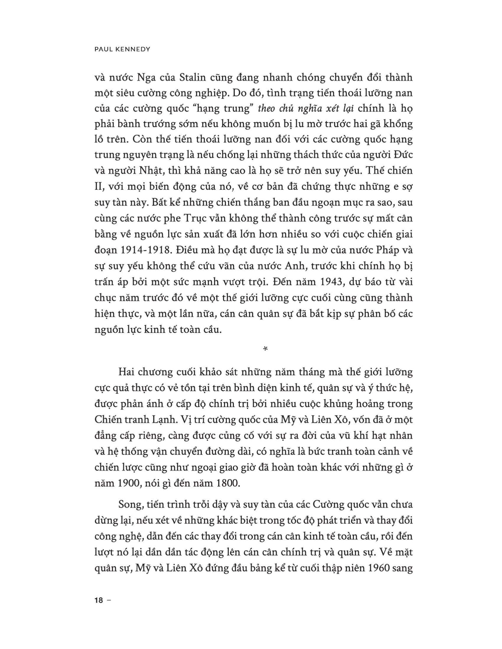 […] ghi chép lịch sử cho thấy có một sự kết nối rõ ràng về lâu về dài giữa sự trỗi dậy và suy tàn về mặt kinh tế của một Cường quốc riêng lẻ và sự phát triển và suy thoái của nó trong vai trò cường quốc quân sự (hay đế chế tầm mức thế giới) trọng yếu. Điều này cũng không có gì phải ngạc nhiên, bởi nó bắt nguồn từ hai thực tế liên quan. Thứ nhất là các nguồn lực kinh tế rất cần thiết để hỗ trợ việc tổ chức quân đội ở quy mô lớn. Thứ hai là đối với hệ thống quốc tế, cả năng lực tài chính lẫn sức mạnh quân sự đều luôn có tương quan và nên được xem là như thế.