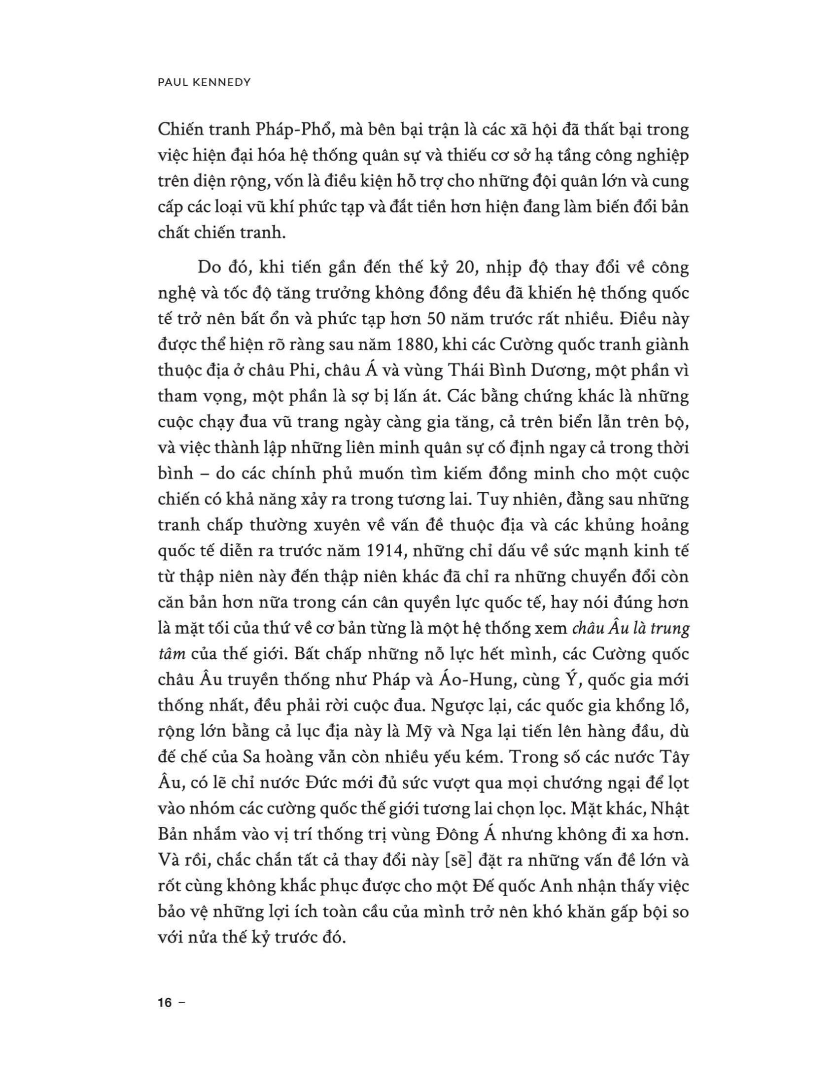 “Kennedy cung cấp cho bạn đọc những lập luận vô cùng giàu tính lịch sử, được minh họa bằng các cuộc tranh giành ngôi vị bá chủ châu Âu của gia tộc Habsburg, người Pháp hay người Đức, cũng như quá trình trỗi dậy và suy tàn của Đế quốc Anh. Tôi băn khoăn liệu đã bao giờ sự trỗi dậy và suy tàn của các cường quốc được tường thuật một cách chuyên nghiệp thế này hay chưa, với những nguồn tin đáng tin cậy, hay với sự chú tâm đến mối liên kết giữa kinh tế, địa lý và chính trị.” - Robert Skidelsky, Independent