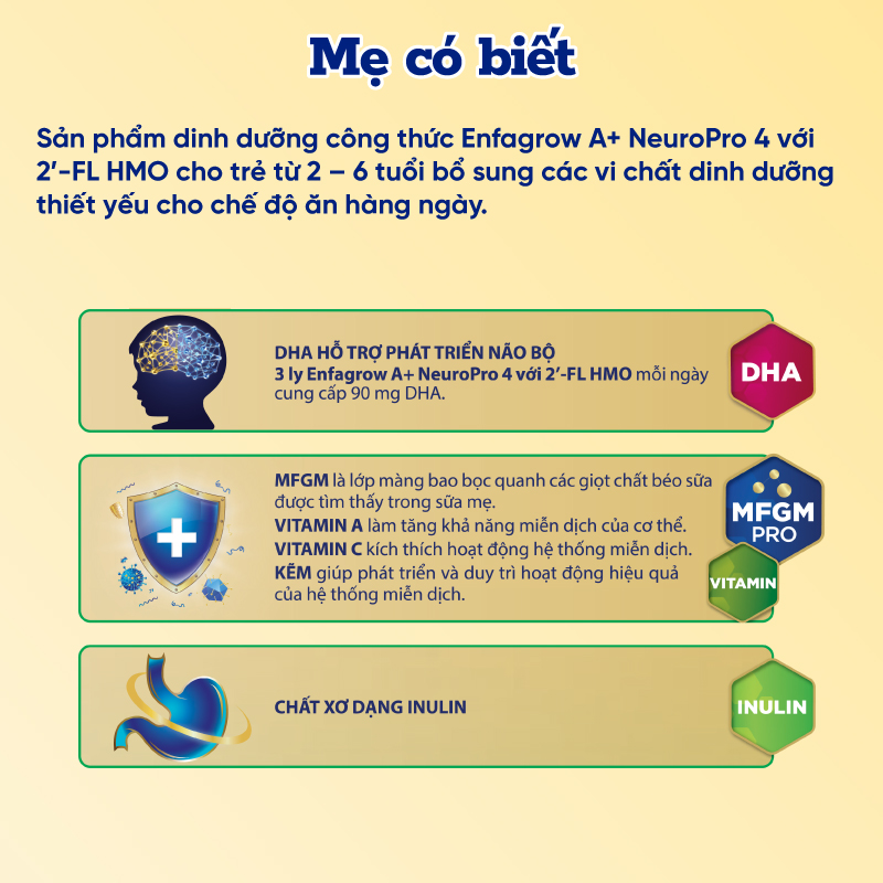 - Sữa bột Enfagrow A+ NeuroPro 4 với 2’-FL HMO có DHA+ & MFGM Pro đẩy nhanh sự phát triển nhận thức ở trẻ về tư duy và tình cảm; cùng với 2’-FL HMO, hệ chất xơ FOS giúp hỗ trợ hệ tiêu hóa và miễn dịch.