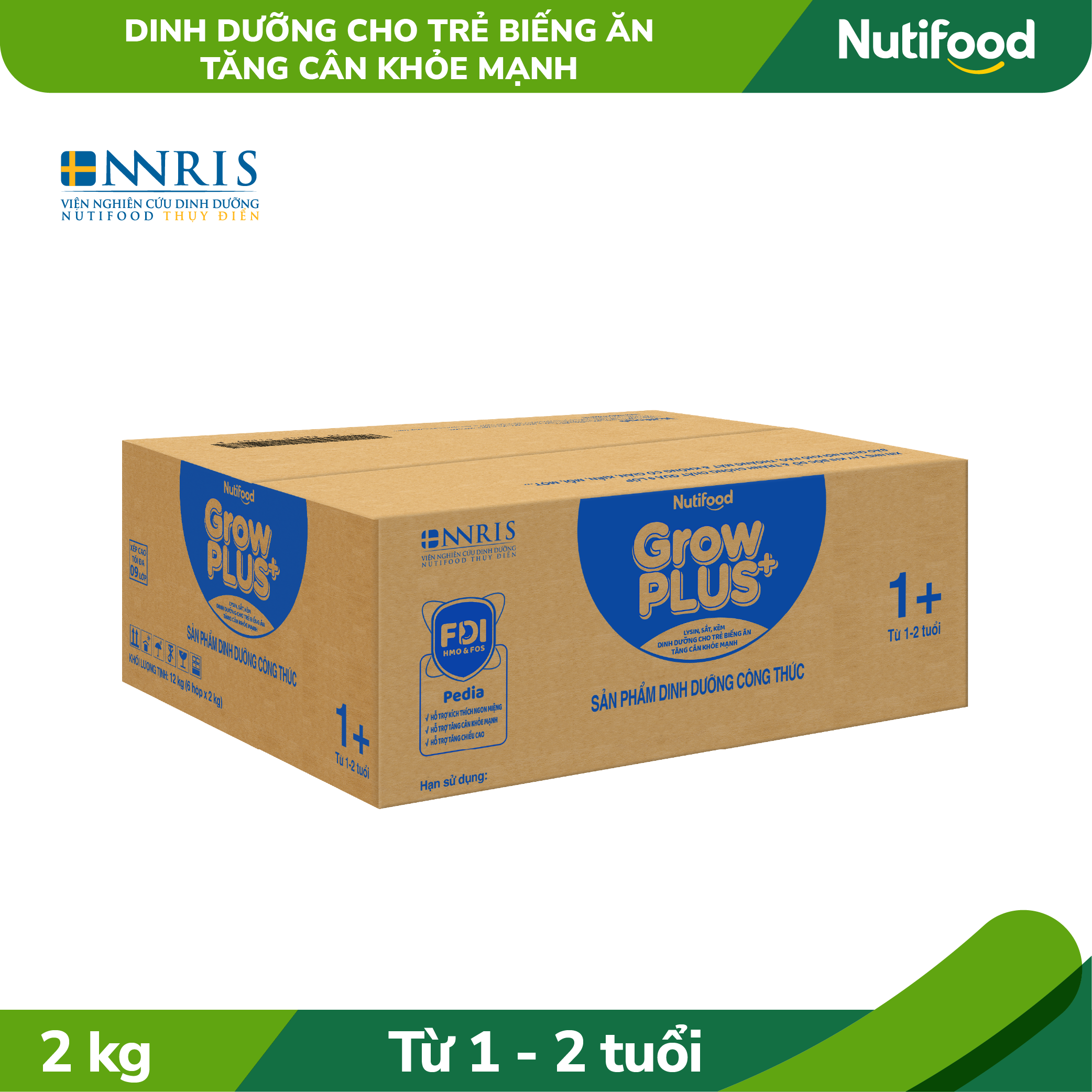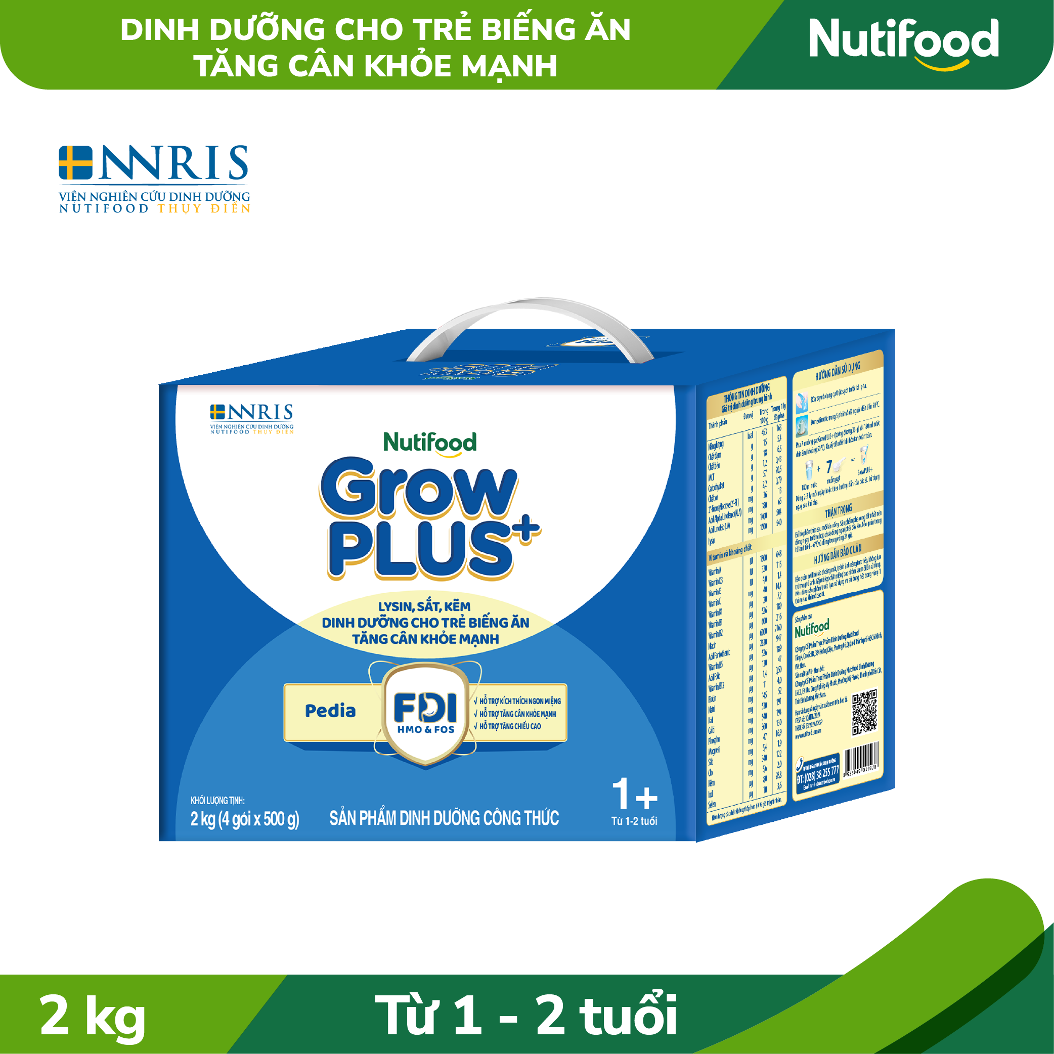 Mô tả sản phẩm: GrowPLUS+ Dinh dưỡng cho trẻ Biếng ăn Tăng cân khỏe mạnh với công thức FDI là sự kết hợp giữa thành tựu khoa học tiên tiến của Nutifood Thụy Điển cùng sự thấu hiểu thể trạng đặc thù của trẻ em Việt Nam của các Chuyên gia dinh dưỡng Nutifood trong 20 năm qua. Đây là công thức xây dựng trên nền tảng “Đề kháng khỏe, Tiêu hóa tốt” được bổ sung 2’-FL HMO nhập khẩu 100% từ Châu Âu, kết hợp cùng FOS, Inulin giúp hấp thu các dưỡng chất, tăng cường sức khỏe hệ tiêu hóa và sức đề kháng. GrowPLUS+ giàu năng lượng, chất đạm, chất béo, bổ sung thêm MCT, Lysin, Sắt, Kẽm... cho trẻ biếng ăn bắt kịp đà tăng trưởng. Đặc biệt, hệ thống quản lý chất lượng ISO 9001 được chứng nhận bởi ABS-QE Hoa Kỳ