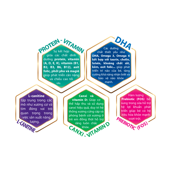 Sau 2 tuổi, não của trẻ tiếp tục phát triển đến một kích thước ổn định và tạo nền tảng cho khả năng học hỏi sau này. Vì vậy trẻ cần cung cấp đầy đủ protein và các vi chất thiết yếu thúc đẩy sự phát triển về thể chất và trí tuệ. MAGECARE GOLD GROW 3 là sản phẩm dinh dưỡng đặc biệt với công thức hoàn toàn mới dành cho trẻ từ 2 tuổi trở lên bổ sung thêm Palatinose cung cấp năng lượng ổn định và liên tục cho các tế bào não, giúp tăng cường khả năng nhận thức và tư duy ở trẻ. Hỗ trợ hệ lợi khuẩn phát triển giúp bé có hệ tiêu hóa khỏe mạnh vượt trội. bé khoẻ mẹ vui. THÔNG TIN SẢN PHẨM: Sự kết hợp giữa các chất dinh dưỡng Protein, Vitamin A - D - E - K, Vitamin B1 - B2 - B3 - B6 - B12, Axít Folic, Phospho, Megie giúp phát triển cân nặng và chiều cao tối ưu. Omega 3 & Omega 6 Các dưỡng chất thiết yếu như DHA - TAURIN - CHOLIN - LUTEIN - AXIT FOLIC - LUTEIN - KHOÀNG CHẤT - Axít F giúp phát triển trí não của bé, tăng cường khả năng nhận biết và bảo vệ não khỏe mạnh. L-CANITINE tập trung trong các mô như xương cơ và tim đóng vai trò quan trọng trong việc sản xuất năng lượng. PREBIOTIC bổ sung trong sữa hỗ trợ hệ lợi khuẩn phát triển giúp bé có hệ tiêu hóa khỏe mạnh vượt trội. Giúp cơ thể hấp thu và sử dụng CANXI hiệu quả, duy trì hệ thống xương cứng cáp và phòng bệnh còi xương ở trẻ em đồng thời hỗ trợ răng luôn chắc khỏe. CHÚ Ý: