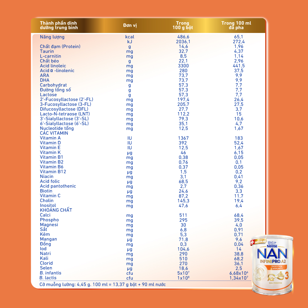 Mua tại TiktokTên sản phẩm: Sản phẩm dinh dưỡng công thức Nestlé NAN INFINIPRO A2 3 800g Xuất xứ: Thụy Sĩ Khối lượng tịnh: 800g/lon Độ tuổi phù hợp: 2 - 6 tuổi Thành phần: SỮA A2 tách kem 29% (A2 Skimmed MILK powder), LACTOSE (từ SỮA-from MILK), WHEY khử khoáng (từ SỮA-WHEY PROTEIN from MILK), Hỗn hợp dầu (dầu hướng dương giàu acid Oleic, dầu hạt cải có hàm lượng acid Erucic thấp, dầu hướng dương, dầu nấm Mortierella alpina, dầu vi tảo Schizochytrium sp., chất chống oxy hóa (Tocopherol concentrat dạng hỗn hợp, Ascorbyl palmitat)), Các vitamin (C, E, Nicotinamid, B5, B1, A, B6, B2, Acid folic, K1, Biotin, D3, B12), Các khoáng chất (Calci citrat, Natri citrat, Dikali hydro phosphat, Magnesi Clorid, Sắt (II) sulphat, Kali citrat, Kẽm sulfat, Đồng sulfat, Mangan sulfat, Kali iodid, Natri selenat), Oligosaccharide (3-Fucosyllactose, 2'-Fucosyllactose, Lacto-N-tetraose, 3'-Sialyllactose, 6'-Sialyllactose, Difucosyllactose), Maltodextrin, Chất nhũ hóa Lecithin ĐẬU NÀNH (SOYA lecithin), Choline bitartrate, Taurine, Chất điều chỉnh độ acid Natri hydroxyd, Inositol, Lợi khuẩn (Bifidobacterium longum subsp. infantis, Bifidobacterium lactis), Nucleotide (Cytidine, Uridine, Adenosine, Guanosine), Chất điều chỉnh độ acid Acid citric, L-carnitine. () có chứa LACTOSE (contain LACTOSE) Cảnh báo: Không sử dụng cho trẻ bị dị ứng với các thành phần của sản phẩm. Nên có sự hướng dẫn của bác sĩ trước khi dùng đối với trẻ không dung nạp đường lactose. Cách pha chế: