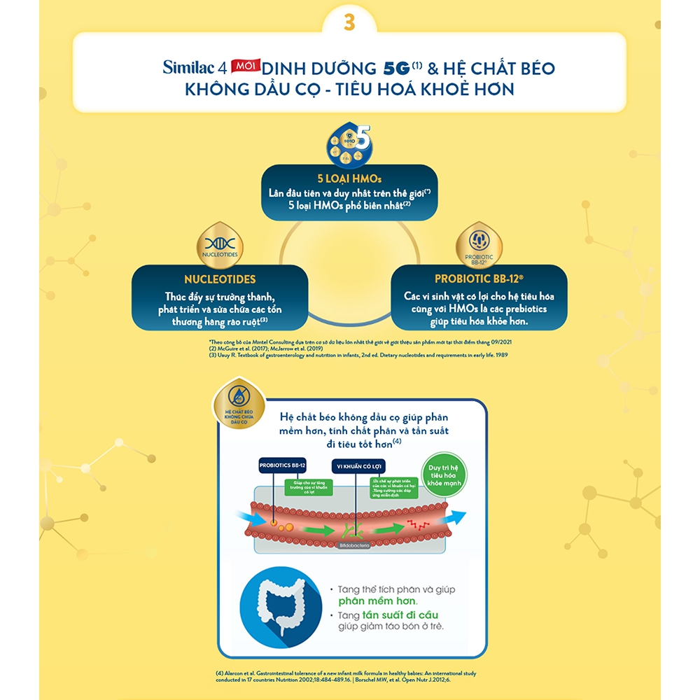 - Sản phẩm giàu canxi và hệ chất béo đặc biệt không chứa dầu cọ giúp hấp thụ canxi và DHA, hỗ trợ phát triển xương và tăng chiều cao. Thành phần dinh dưỡng Sữa không béo, lactose, DẦU THỰC VẬT (chứa: dầu hướng dương giàu oleic, dầu đậu nành, dầu dừa), đạm whey cô đặc, bột bơ sữa, KHOÁNG CHẤT (kali citrat, canxi carbonat, magiê clorid, kali hydroxit, sắt sulfat, natri clorid, kẽm sulfat, đồng sulfat, canxi clorid, tricanxi phosphat, mangan sulfat, kali iodid, natri selenat), đạm whey thủy phân, 5 HMOs (2'-fucosyllactose, lacto-N-tetraose, 3- fucosyllactose, 6'-sialyllactose, 3'-sialyllactose), acid arachidonic (AA), VITAMIN (acid ascorbic, RRR-α- tocopheryl acetat◊, niacinamid, canxi d-pantothenat, retinyl palmitat, thiamin hydroclorid, pyridoxin hydroclorid, riboflavin, acid folic, phylloquinon, d-biotin, cholecalciferol, cyanocobalamin), chất nhũ hóa lecithin đậu nành, acid docosahexaenoic (DHA), cholin bitartrat, NUCLEOTIDES (cytidin 5'-monophosphat, dinatri guanosin 5'- monophosphat, dinatri uridin 5'-monophosphat, adenosin 5'-monophosphat), cholin clorid, taurin, L-tryptophan, myo-inositol, ascorbyl palmitat, Bifidobacterium lactis BB- 12, hỗn hợp tocopherol, L- carnitin, CAROTENOID (lutein, β- caroten) ◊ Vitamin E tự nhiên BB-12: thương hiệu của Chr. Hansen Đối tượng sử dụng Dành cho bé từ 2 -6 tuổi Hướng dẫn sử dụng