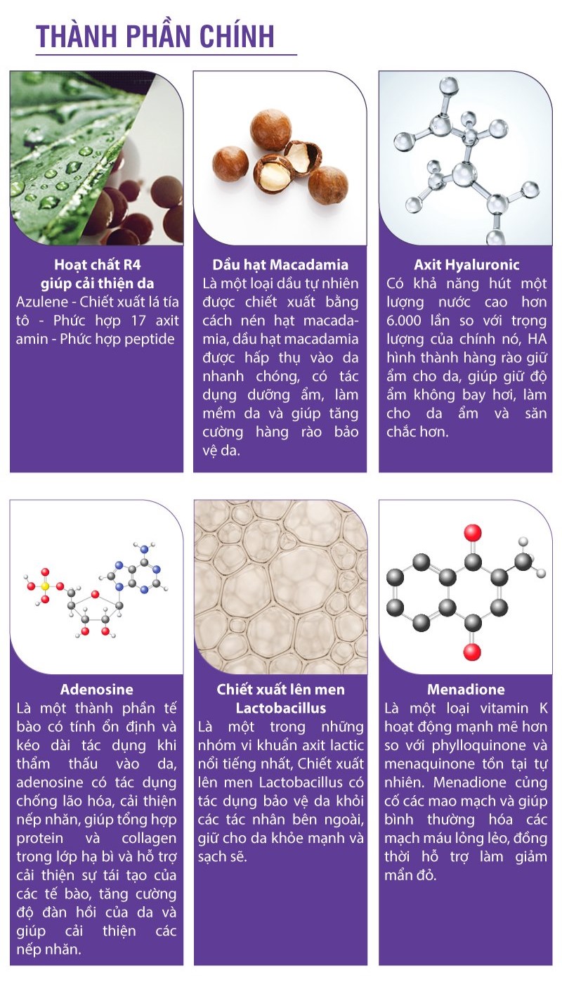 - Được tăng cường bổ sung Azulene giúp làm dịu tức thì, vỗ về ngay lập tức làn da bị kích ứng, mẩn đỏ, mỏng đỏ, tổn thương...