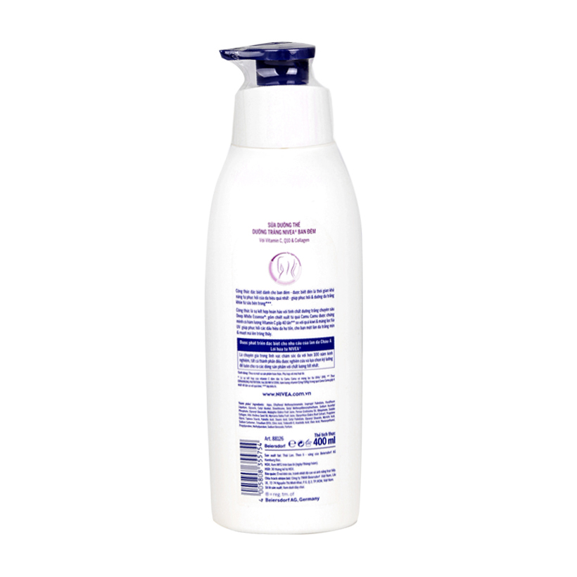 Sữa dưỡng thể trắng da ban đêm Nivea Extra White Night Nourish với vitamin C, Q10, collagen giúp phục hồi và dưỡng da trắng khỏe từ sâu bên trong. Công thức là sự kết hợp
