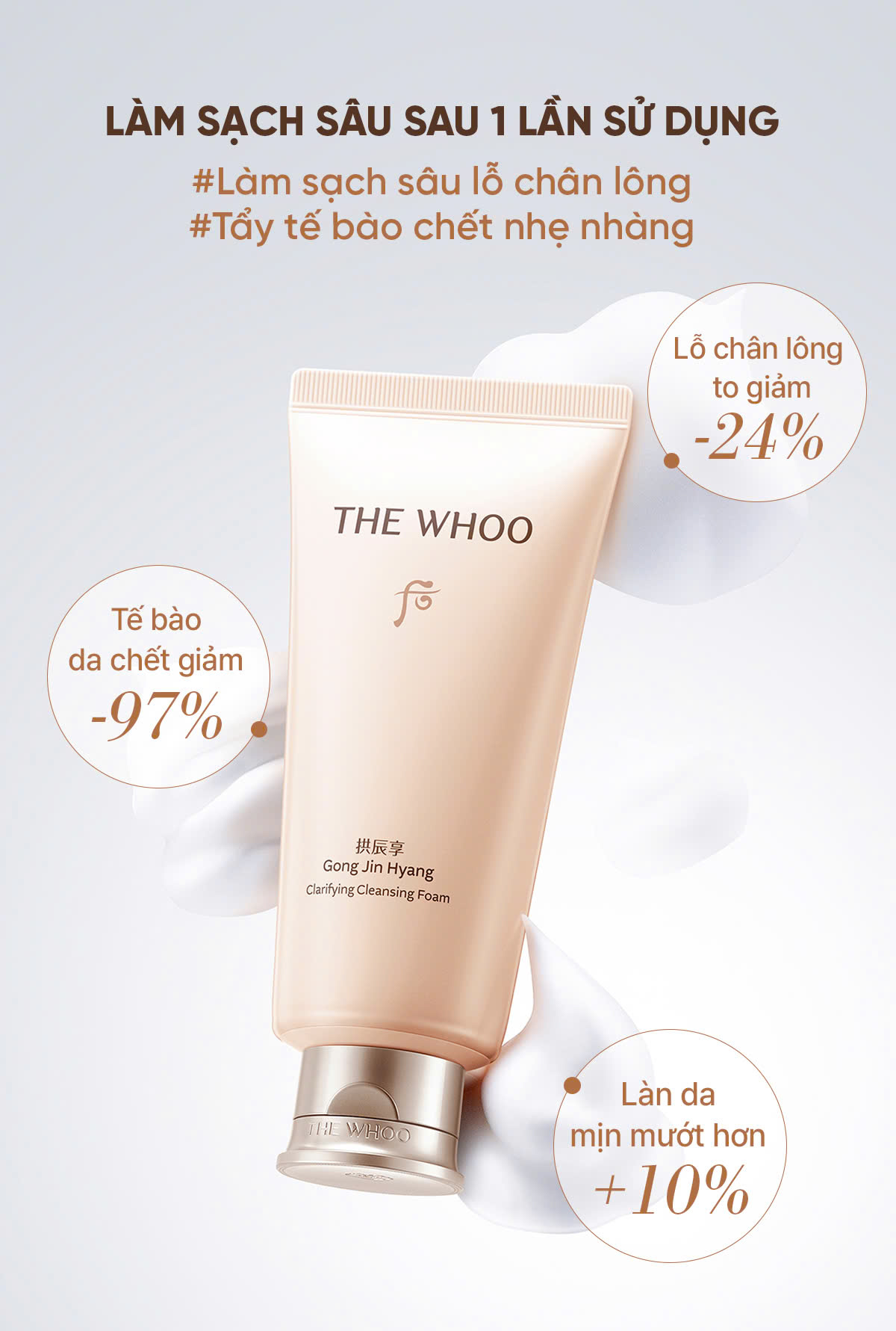 Sữa rửa mặt với công thức Gong Jin SolutionTM, làm sạch thông minh với bọt mịn như kem, loại bỏ hoàn hảo các tạp chất, đồng thời bảo vệ hàng rào độ ẩm của da.