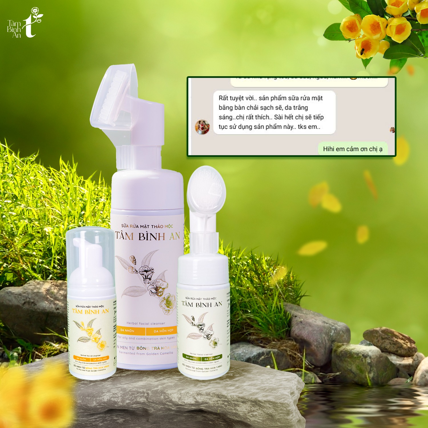 Mô tả: Sữa rửa mặt thảo mộc Tâm Bình An gồm các thành phần chủ yếu từ thiên nhiên, chiết xuất từ Trà Hoa Vàng mang tới các công dụng như làm sạch sâu, làm