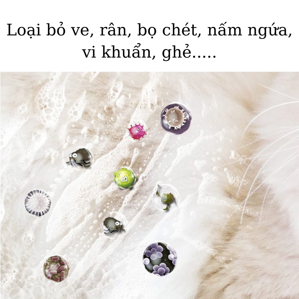 [GIỚI THIỆU] [CÔNG DỤNG] Tắm cho thú lơn hay nhỏ đều được, tắm được cho cả chó, mèo: Trị nấm da, vảy, ngứa. Tiêu diệt ve, ghẻ, bọ chét, rận tai Mượt lông, dưỡng lông