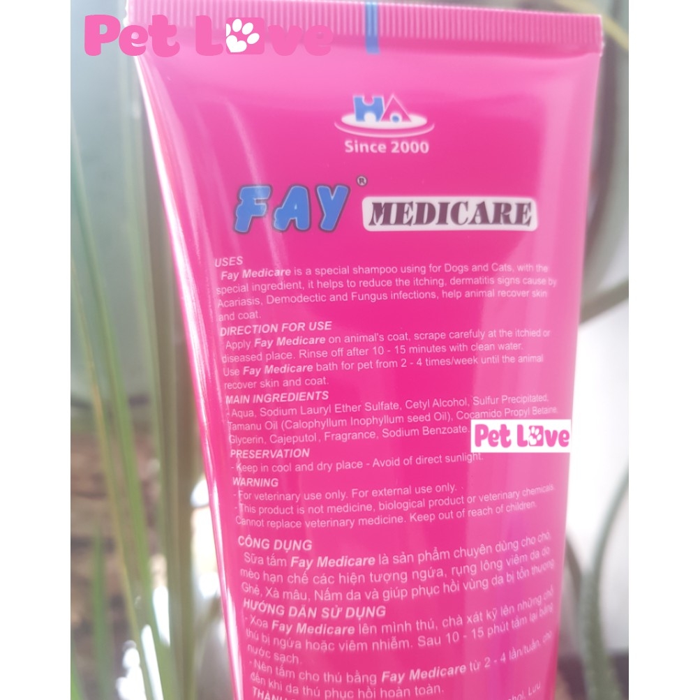 - Để đạt hiệu quả tối đa, nên tắm sữa tắm FAY Medicare trong thời gian đầu từ 3 - 4 lần/ tuần, giảm xuống 1 - 2 lần/ tuần cho đến khi da và lông thú phục hồi hoàn toàn. Bảo quản: