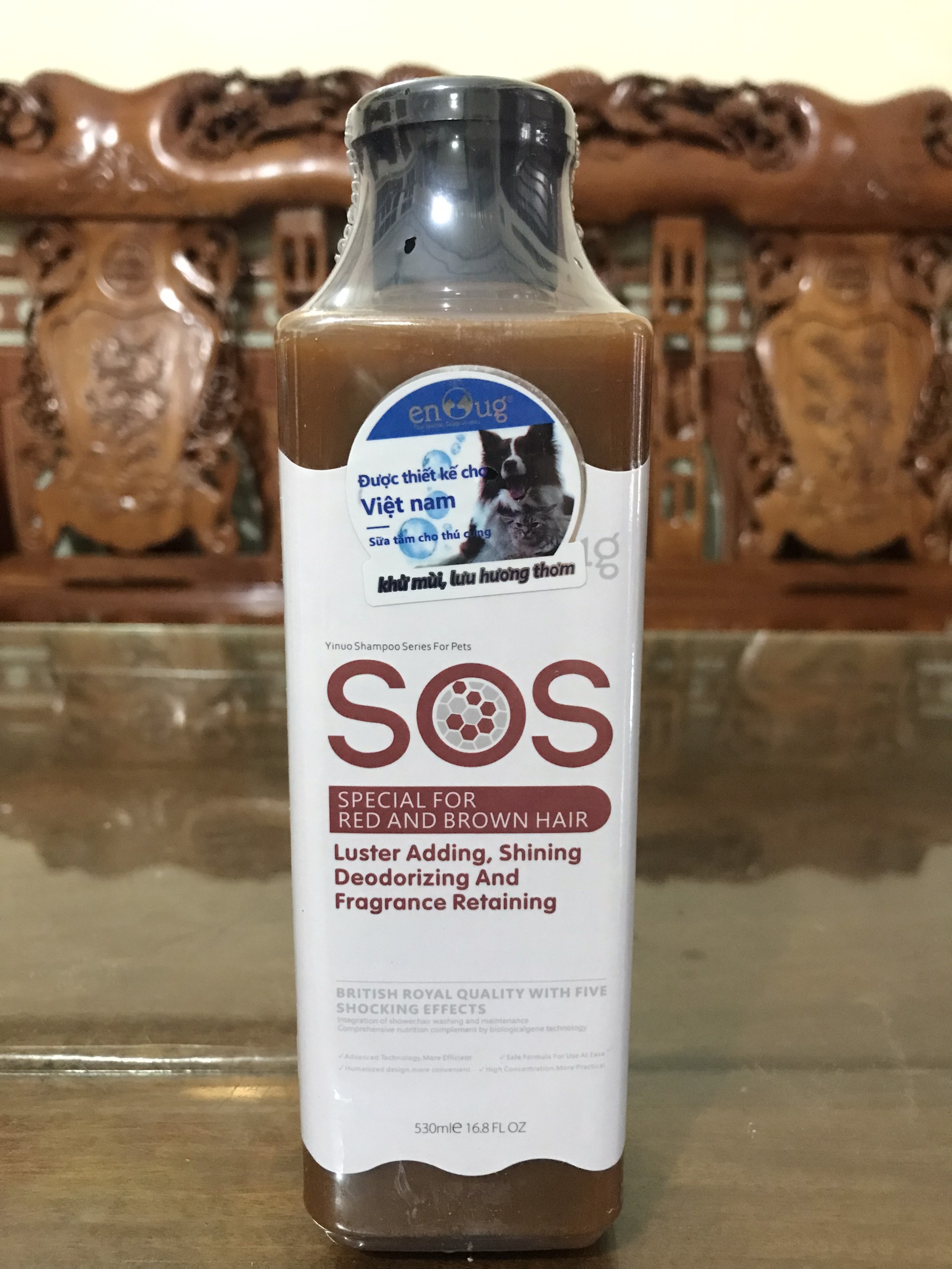SỮA TẮM CHÓ MÈO SOS 530ml có nhãn được thiết kế cho thị trường Việt Nam - Công dụng của sữa tắm chó mèo SOS: làm sáng màu lông, loại bỏ bụi bẩn, khử mùi,