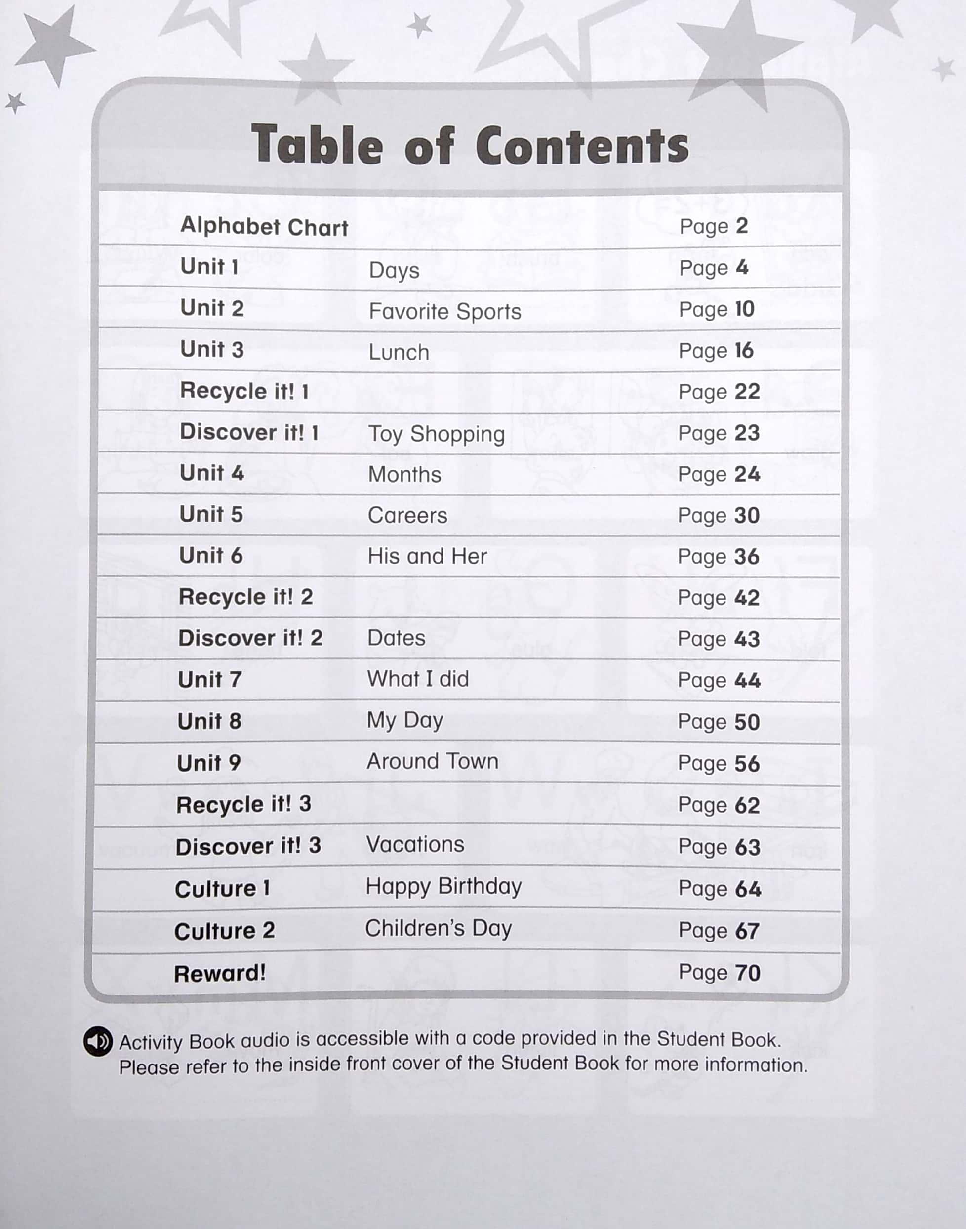 The Activity Book offers further practice of language items introduced in the Student Book. Audio for the activity book is accessed using the access code from the Student Book.