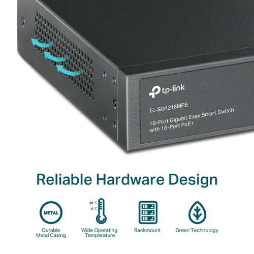Thông số kỹ thuật: 18-Port Gigabit with 16-Port PoE+ Easy Smart Switch TP-LINK TL-SG1218MPE - 16 cổng Gigabit RJ45 hỗ trợ PoE+, 2 cổng Gigabit RJ45 không hỗ trợ PoE và 2 khe cắm SFP Combo Gigabit. - Công suất PoE lên đến 250W, phù hợp cho các hệ thống giám sát doanh nghiệp nhỏ và vừa. - Tính năng ưu tiên cổng đảm bảo chất lượng cho các ứng dụng nhạy cảm như giám sát video. - Khôi phục tự động PoE tự động khởi động lại các thiết bị PoE bị mất kết nối hoặc không phản hồi. - Quản lý công suất thông minh bảo vệ switch khỏi tình trạng quá tải. - Chất lượng Dịch vụ (QoS) đảm bảo lưu lượng mạng mượt mà cho các ứng dụng nhạy cảm với độ trễ. - IGMP Snooping tối ưu hóa việc phân phối lưu lượng đa phương tiện, như IPTV.