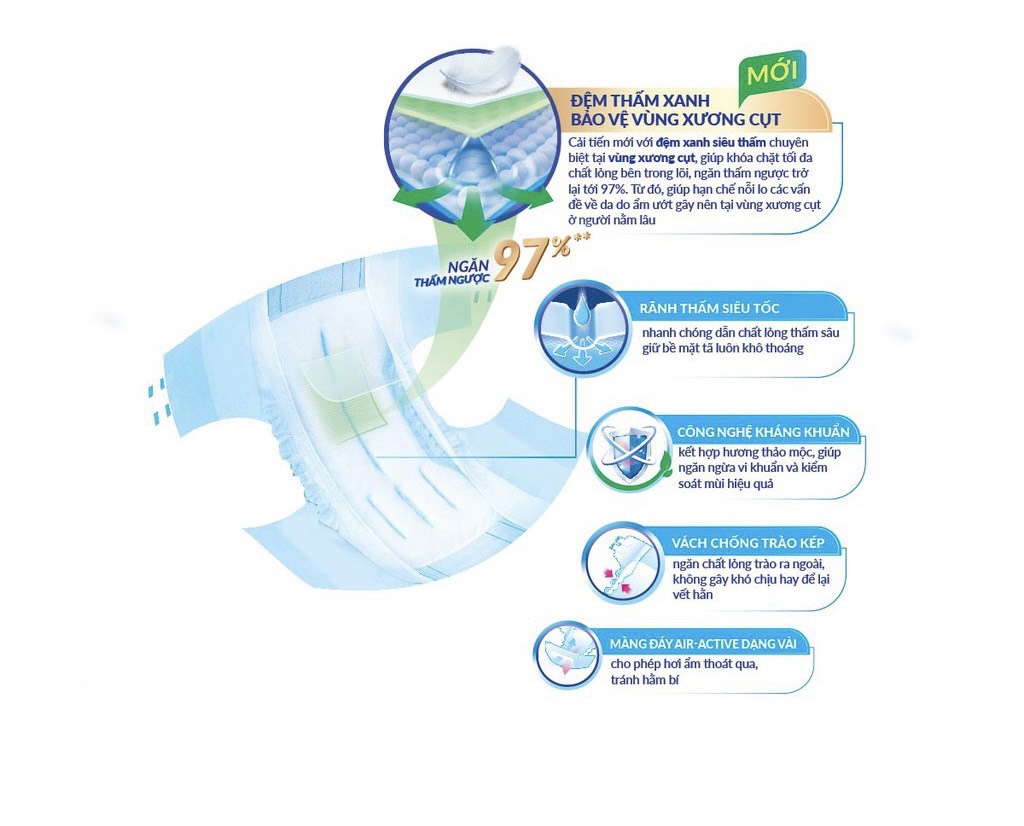 Màng đáy thoáng khí dạng vải 100% Air-active: Với 100% diện tích biết thở, cho phép hơi ẩm dễ dàng thoát ra ngoài, tránh hằm bí và giúp da hô hấp với không khí tự nhiên, hỗ trợ chống loét tì đè Hiển thị độ ẩm ướt: Khi tã thấm hút nhiều, lớp mực in sẽ mờ dần báo hiệu thời điểm thay tã