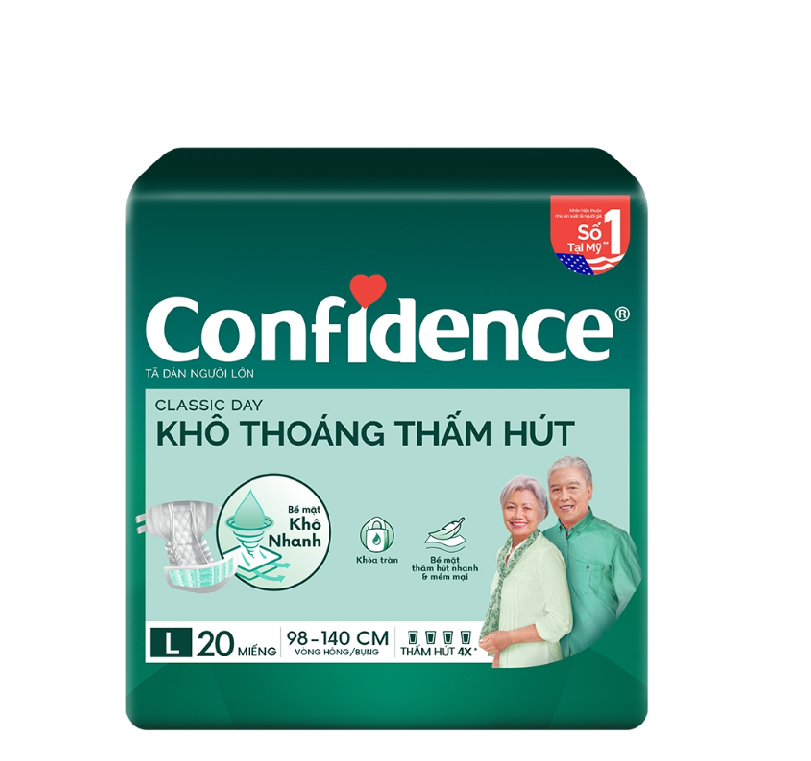 Tã dán người lớn CONFIDENCE CLASSIC DAY size L gói 20+3 miếng - an tâm, thoải mái cho cả gia đình. Sản phẩm tăng cường độ thấm hút và giữ bề mặt tã luôn khô thoáng, là lựa chọn hiệu quả cho người dùng hạn chế khả năng đi lại.
