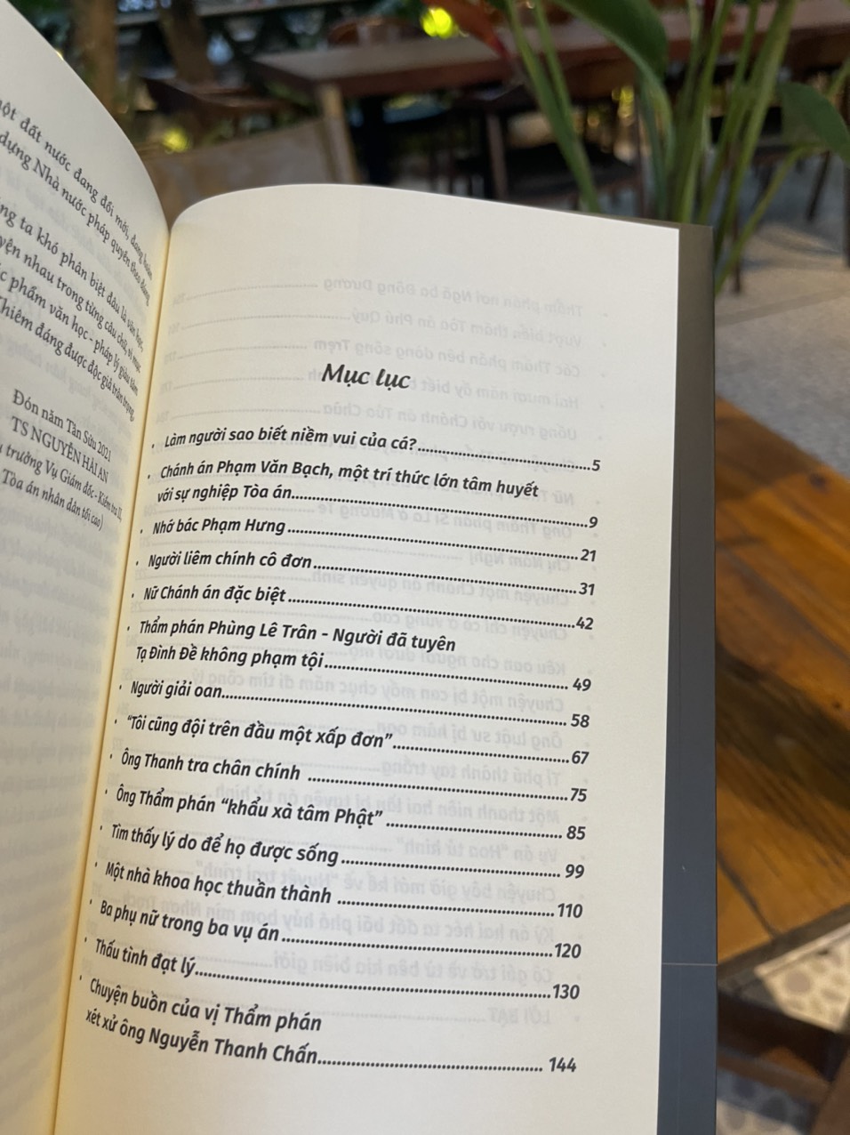 Hơn 30 bài viết trong cuốn sách này đều có nhân vật trung tâm là con người, trong đó, có tới 22 bài viết về những con người có quyền trong việc tìm kiếm và thực thi công lý. Có thể thấy trong 22 bài viết này biết bao câu chuyện cảm động về những nhân cách lớn trong ngành Tòa án được Nguyễn Phan Khiêm kể lại: Các Chánh án tối cao mà tên tuổi đi vào lịch sử ngành tư pháp Việt Nam và các chánh án ở địa phương trên cả nước, là chủ nhiệm Ủy ban Pháp luật của Quốc hội, là thẩm phán các cấp từ trung ương tới địa phương, từ thủ đô tới những miền quê xa xôi, hay nhà khoa học trong ngành Tòa án - họ là đại diện của lương tri và phẩm giá, hiểu biết và thấu cận nhân tình, là nơi gửi gắm hy vọng của biết bao người gặp oan khuất trong đời. Là những người có cái đầu lạnh và trái tim nóng, trên cương vị công tác, họ đã vượt qua biết bao thử thách để bảo vệ ánh sáng của công lý, đưa công bằng tới cho muôn dân.