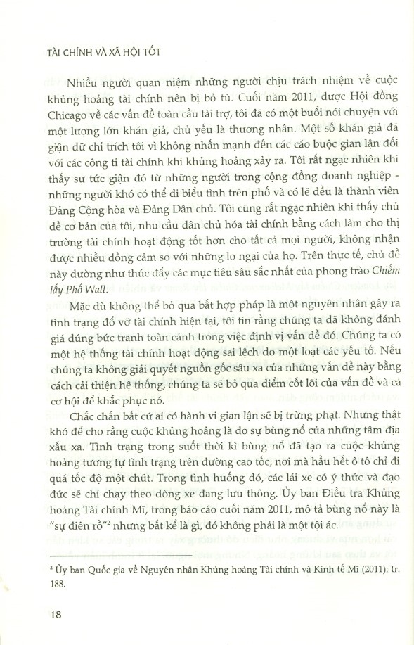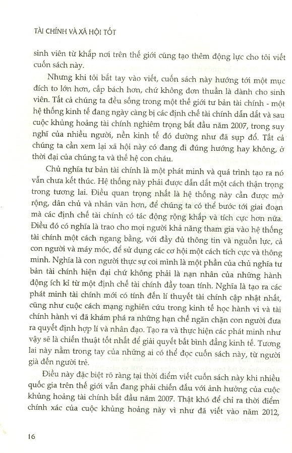 Robert J. Shiller (sinh năm 1946), Giáo sư Kinh tế tại Đại học Yale. Ông tốt nghiệp Đại học Michigan năm 1967, nhận bằng Tiến sĩ Kinh tế tại Học viện Công nghệ Massachusetts năm 1972. Ông đoạt Giải Nobel Kinh tế năm 2013 cùng với Eugene Fama và Lars Peter Hansen. Robert J. Shiller là tác giả của nhiều đầu sách nổi tiếng viết về thị trường tài chính, đổi mới tài chính, kinh tế học hành vi, kinh tế vĩ mô, bất động sản, phương pháp thống kê, về thái độ, quan điểm và đánh giá đạo đức của công chúng với thị trường. Một số tác phẩm nổi bật: -Market Volatility (Biến động thị trường) - 1989 -Macro Markets (Thị trường vĩ mô) - 1993 -The New Financial Order: Risk in the 21st (Trật tự tài chính mới: Rủi ro trong thế kỉ 21) - 2003 -Irrational Exiberance (Hưng phấn bất hợp lí) - 2000 -The Subprime Solution (Giải pháp cho vay dưới chuẩn - 2008 -Animal Spirits (Tâm lí bầy đàn - 2009 (Cùng với George A.Akerlof). 2) Tác phẩm Tài chính và xã hội tốt, cuốn sách dành cho hàng nghìn sinh viên ở khắp nơi trên thế giới đang chuẩn bị theo học các khóa học về chuyên ngành kinh tế và tài chính tại các trường đại học, hàng vạn thanh niên sắp bắt đầu các công việc có liên quan, ở một khía cạnh nào đó, đến hoạt động tài chính. Dù thế hệ sinh viên và chuyên gia trẻ trong các lớp học, các tập đoàn, tổ chức phi lợi nhuận, cơ quan quản lí hiện nay không có gì đặc biệt nhưng những năm gần đây có điều gì đó rất mới về nét văn hóa mà họ sẽ học được. Nghĩa là vai trò của các công nghệ tài chính mới trong việc gây ra cuộc khủng hoảng tài chính hiện tại đã trở thành vấn đề thu hút sự quan tâm của tất cả mọi người, đồng thời cũng là vấn đề cần được nghiên cứu chuyên sâu. Cuốn sách gồm hai phần chính và một phần giới thiệu. Phần giới thiệu đưa ra bối cảnh của chủ nghĩa tư bản tài chính trong lịch sử hiện đại và xã hội toàn cầu, nhấn mạnh đến tính trung tâm của các đổi mới tài chính, từ thị trường chứng khoán đến thị trường thế chấp, trong việc góp phần đạt được tất cả các mục tiêu lâu dài khác nhau của con người và vai trò “quản lí” tài sản xã hội của ngành tài chính. Phần 1, “Vai trò và Trách nhiệm”, tiếp tục xây dựng vai trò của các chuyên gia tài chính - gồm các chuyên gia ngân hàng, kế toán viên, luật sư, chuyên gia đầu tư ngân hàng, nhà điều tiết và nhiều người khác - khi thực hiện vai trò của mình trong xã hội tốt. Phần 2, “Tài chính và những bất mãn”, được viết từ một góc nhìn khác, đưa ra một loạt câu hỏi về đạo đức và bản chất của tài chính trong một xã hội đang phát triển.
