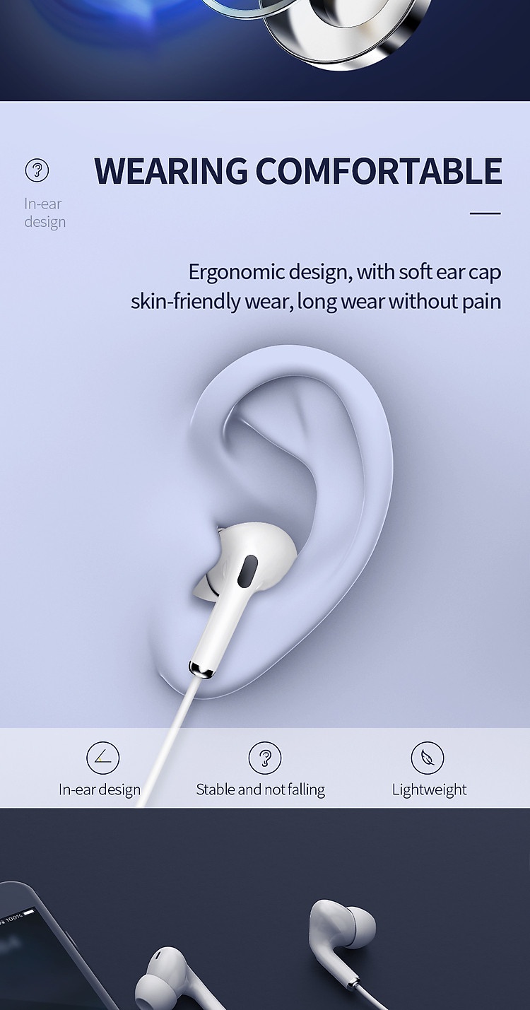 Loa: 12 mm. Chân cắm âm thanh: 3,5mm. Trọng lượng: 12g. Cáp tai nghe: Cáp đàn hồi cao TPE có dây tráng men Micrô: bộ điều khiển có micro. Điều khiển dây: được hỗ trợ