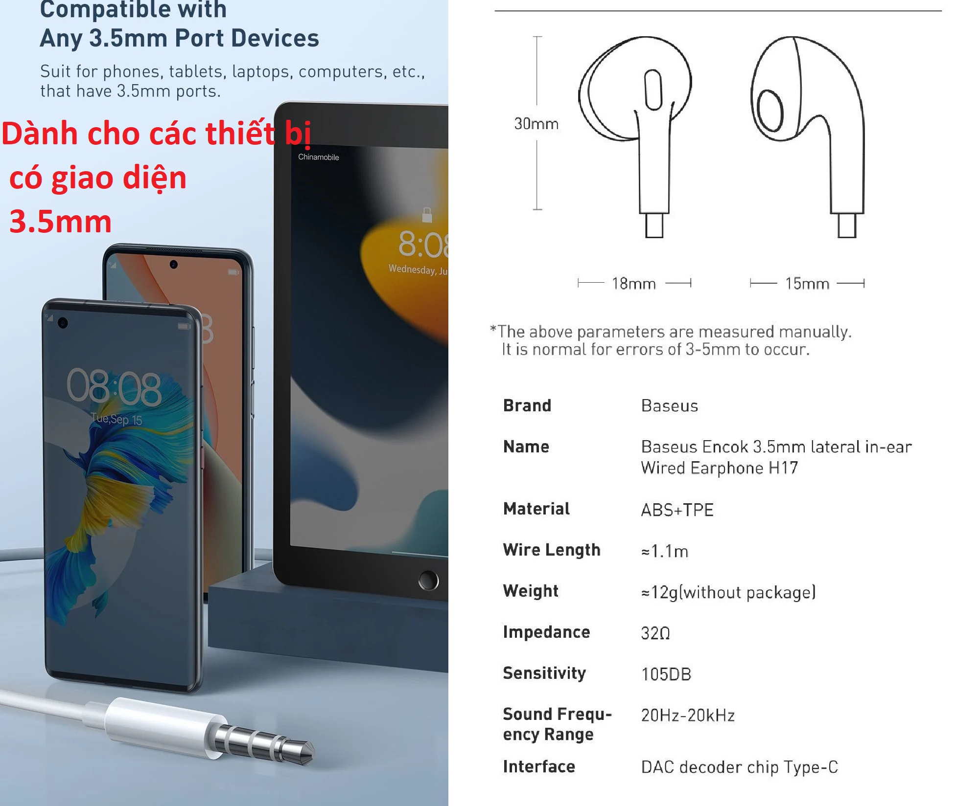 BASEUS Encok H17 3.5mm Sideal in-earphone Button Control Headphones Tai nghe nhẹ Tương thích với các thiết bị cổng 3.5mm hỗ trợ gọi thoại độ nét cao Cuộn dây di chuyển lớn 14mm: Màng PET