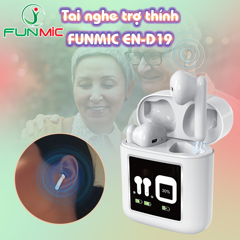 Tai nghe trợ thính không dây FUNMIC EN-D19 dòng cao cấp, máy phù hợp cho người già, người lớn tuổi hay bị điếc, lãng tai, có vấn đề về thính giác từ nhẹ tới nặng Bạn đang tìm mua máy trợ thính cho ông bà cha mẹ sử dụng thì tai nghe trợ thính không dây FUNMIC EN-D19 là một lựa chọn rất đáng để bạn tham khảo. Với thiết kế dạng tai nghe nhỏ gọn, trọng lượng siêu nhẹ, ông bà cha mẹ sẽ có cảm giác thoải mái khi đeo. Hệ thống xử lý âm thanh hiện đại giúp âm thanh được tái tạo một cách chân thật, khuyết đại âm giúp người thân của bạn nghe rõ mọi âm thanh từ cuộc sống. Gọi ngay 1900 2807 để đặt mua tai nghe trợ thính không dây FUNMIC EN-D19 với giá tốt, hàng chính hãng. "FUNMIC thương hiệu Việt vì sức khỏe người Việt" Đặc điểm nổi bật của tai nghe trợ thính không dây FUNMIC EN-D19: