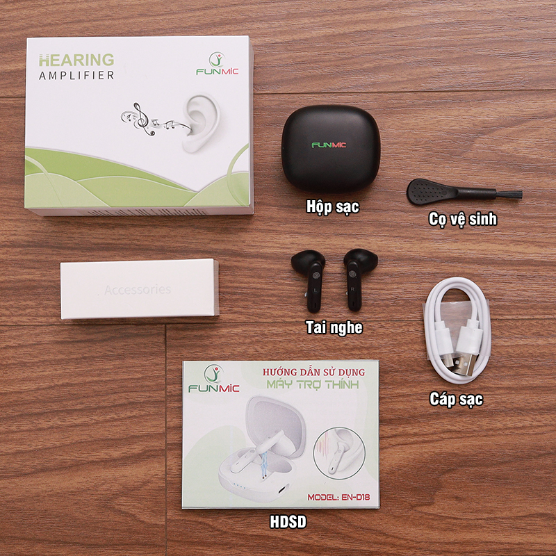 Mua tại TiktokTai nghe trợ thính không dây Funmic EN-D18 Tai nghe trợ thính không dây Funmic EN-D18 là một sản phẩm tiên tiến giúp cải thiện khả năng nghe của người dùng, đặc biệt dành cho những ai gặp vấn đề suy giảm thính lực ở nhiều mức độ khác nhau. Với công nghệ xử lý âm thanh hiện đại và thiết kế tối ưu, sản phẩm không chỉ mang lại trải nghiệm nghe tự nhiên mà còn rất thoải mái khi sử dụng hàng ngày. Hãy mua ngay cho ông bà , cha mẹ của bạn chiếc máy trợ thính không dây Funmic EN-D18 để giúp họ nghe rõ mọi thâm thanh từ cuộc sống nhé Đặc điểm nổi bật của tai nghe trợ thính không dây Funmic EN-D18: