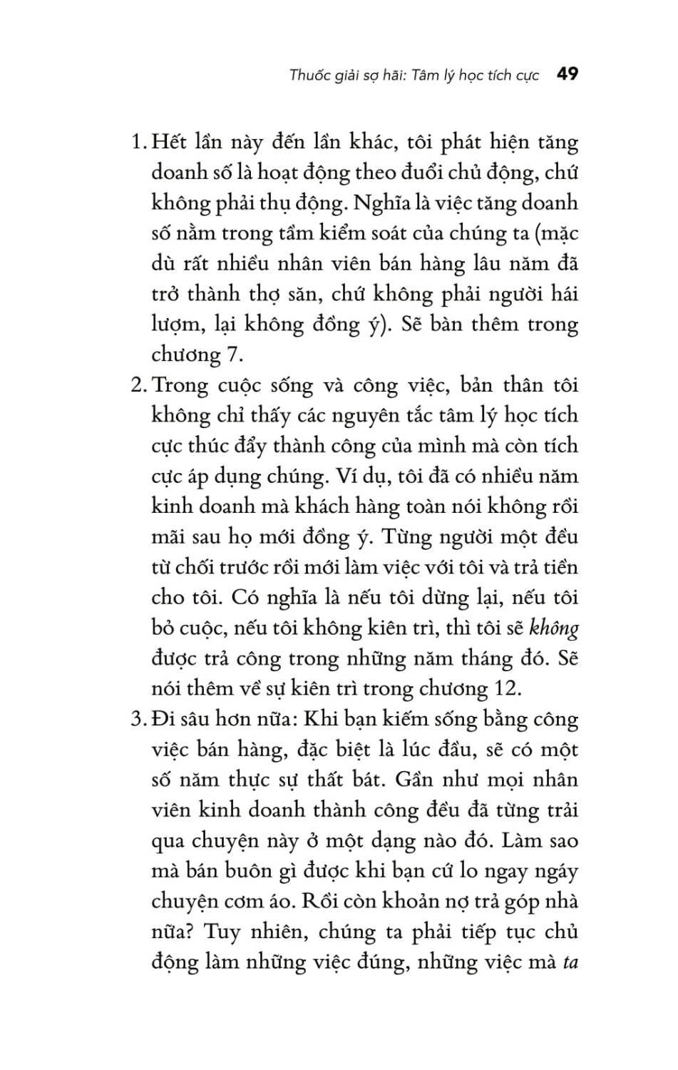 Bạn sẽ học được đúng cách vượt qua nỗi sợ hãi — sát thủ “diệt” doanh số — và thay bằng sự tự tin, lạc quan, lòng biết ơn, niềm vui và chủ động trong công việc bán hàng. Đây là cuốn sách đầu tiên vận dụng tâm lý học tích cực để biến đổi cách chúng ta làm việc giúp bạn bán được nhiều hơn.