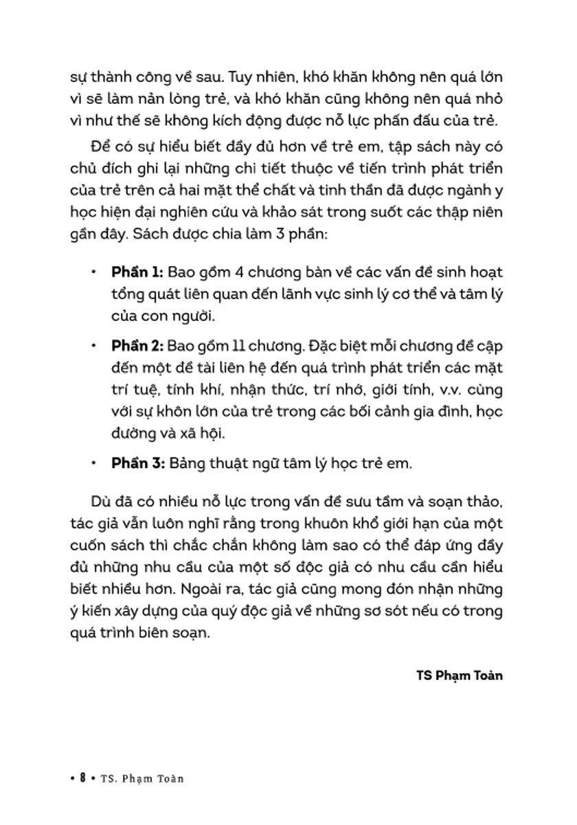Để có sự hiểu biết đầy đủ hơn về trẻ em, tập sách này có chủ đích ghi lại những chi tiết thuộc về tiến trình phát triển của trẻ trên cả hai mặt thể chất và tinh thần đã được ngành y học hiện đại nghiên cứu và khảo sát trong suốt các thập niên gần đây. Sách được chia làm 3 phần: