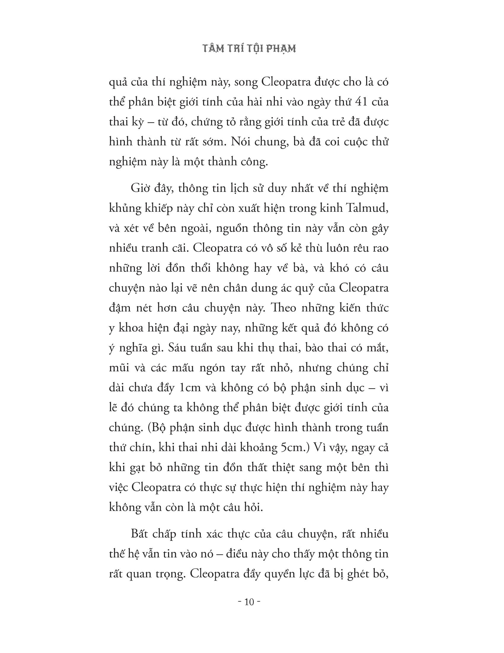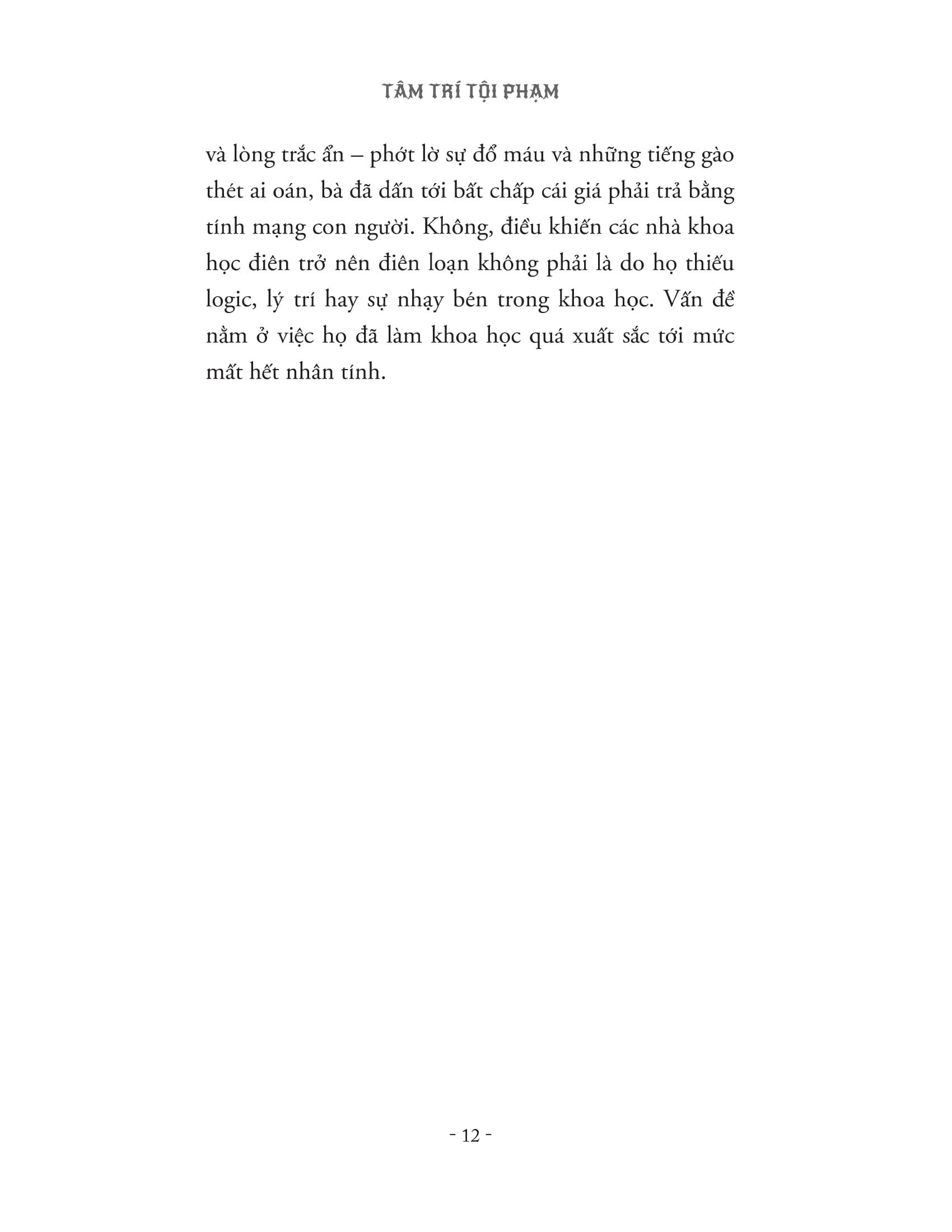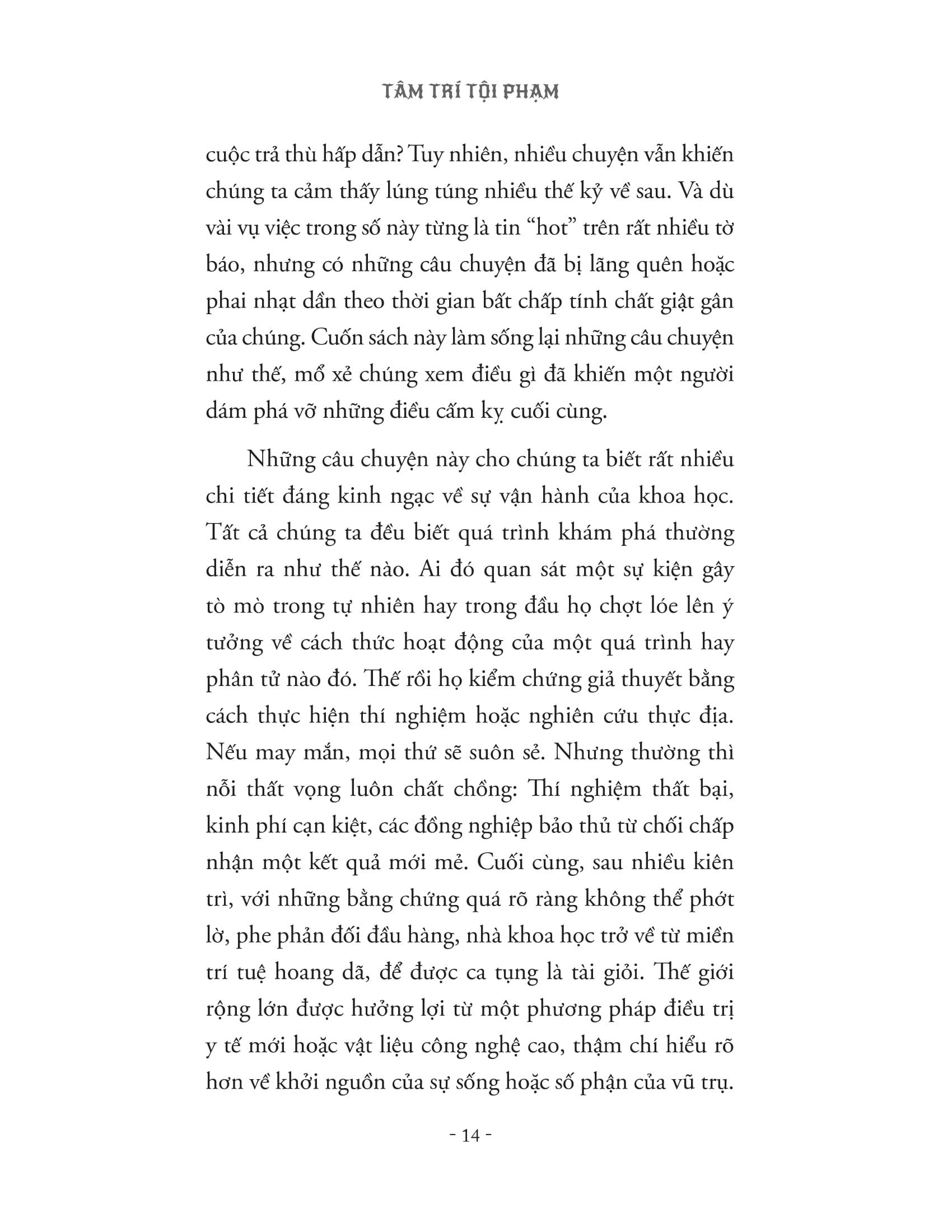 Không nao núng và phấn khích đến trang cuối cùng, “Tâm trí tội phạm” là sự kết hợp bộ phim khám phá khoa học với sự hồi hộp bất hợp pháp của những câu chuyện tội phạm có thật. Với sự thông minh và chính xác đặc trưng của mình, Kean cho thấy rằng, trong khi khoa học có ích hơn là hại trên thế giới, thì các nhà khoa học giả mạo vẫn tồn tại, và khi hy sinh đạo đức vì sự tiến bộ, chúng ta thường sẽ không bao giờ đạt được kết quả.