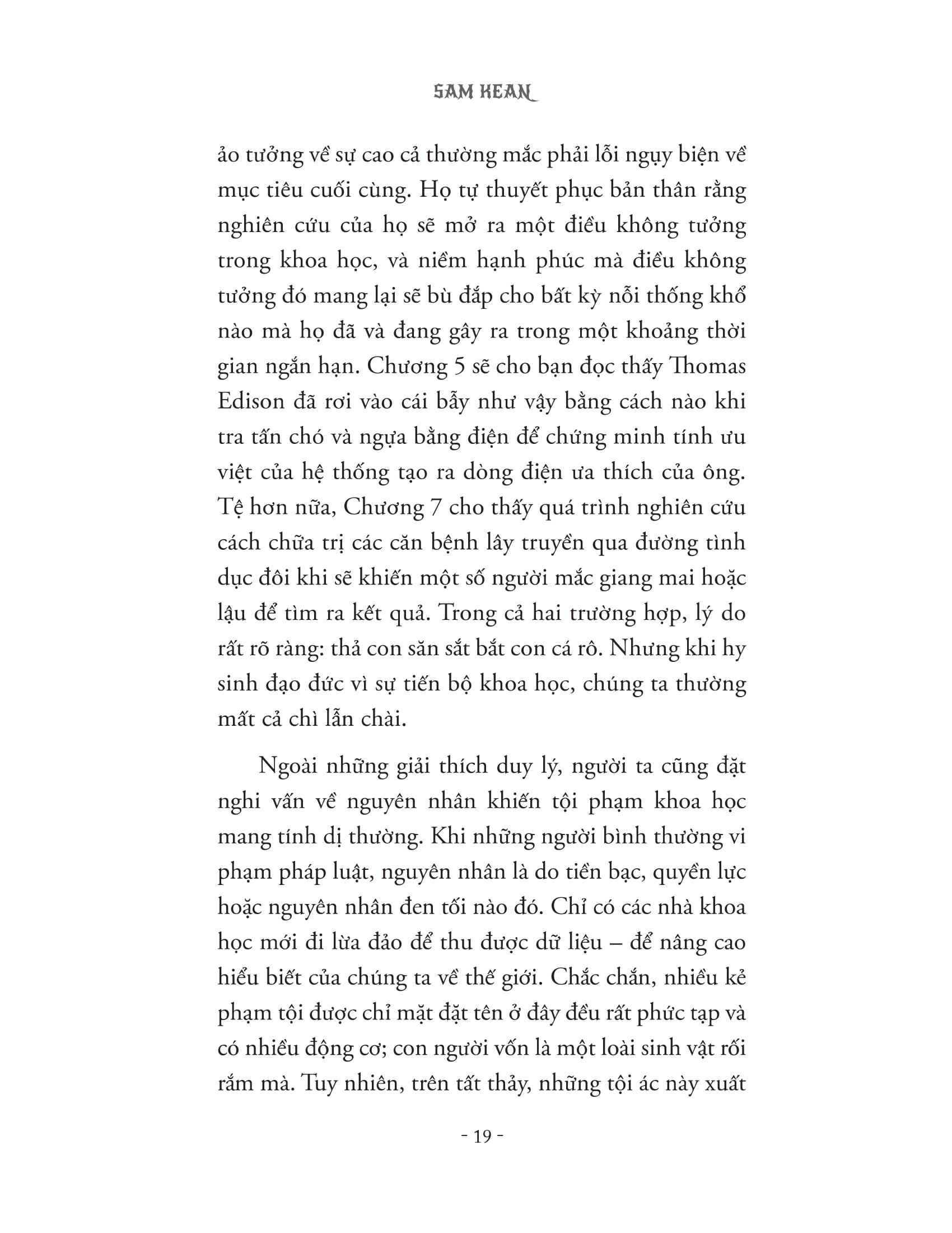 Cuốn sách tiết lộ nguồn gốc của phần lớn khoa học hiện đại về hoạt động buôn bán nô lệ xuyên Đại Tây Dương vào những năm 1700, cũng như vai trò của Thomas Edison với sự ra đời của ghế điện và logic sai lệch của những điệp viên đã thâm nhập vào Dự án Manhattan. Nhưng những tội lỗi của khoa học không phải tất cả đều được chôn vùi an toàn trong quá khứ. Kean nhắc nhở chúng ta rằng nhiều trong số đó vẫn còn ảnh hưởng đến chúng ta ngày nay.