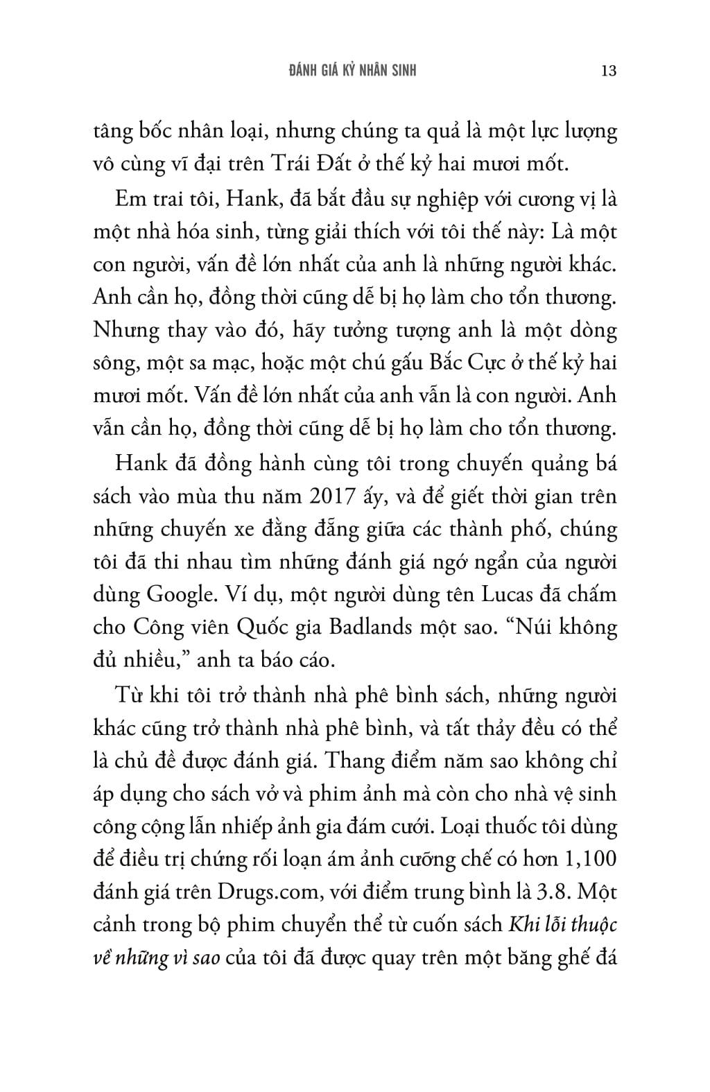 Các bài viết trong "Đánh giá kỷ nhân sinh" một lần nữa cho thấy tài kể chuyện hiếm có của John Green. Tác phẩm là cuộc hành trình khám phá đầy cảm hứng về những con đường mà chúng ta đã khai mở, đồng thời là một lời tụng ca chân thành về tình yêu dành cho thế giới.