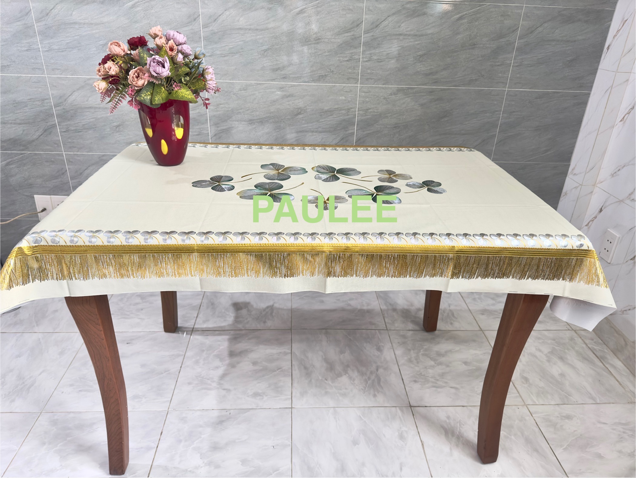 Khăn Trải Bàn PAULEE - FY 065K kiểu dáng hình chữ nhật kết hợp nhủ vàng , góp phần tô điểm cho không gian bàn ăn thêm sang trọng, hiện đại. - Chất liệu mềm