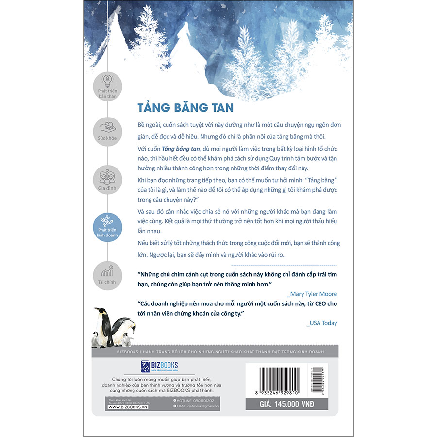 Mô tả: “Tảng băng tan” là cuốn sách thật tuyệt vời, là hiện thân của các lời phán truyền mạnh mẽ và có thể giúp đỡ nhiều người. Cuốn sách này đã cho chúng ta biết tất cả các bước để thành công trong một thế giới đang thay đổi, từ việc tìm ra các vấn đề quan trọng, lập biểu đồ sự việc, tạo sự thấu hiểu và đồng thuận, đến việc đối phó với những người không muốn thay đổi