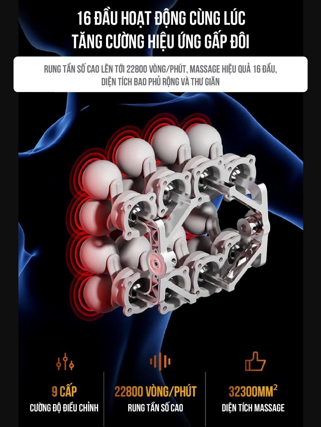 - Rung tần số cao , massage hiệu quả gấp 16 lần.