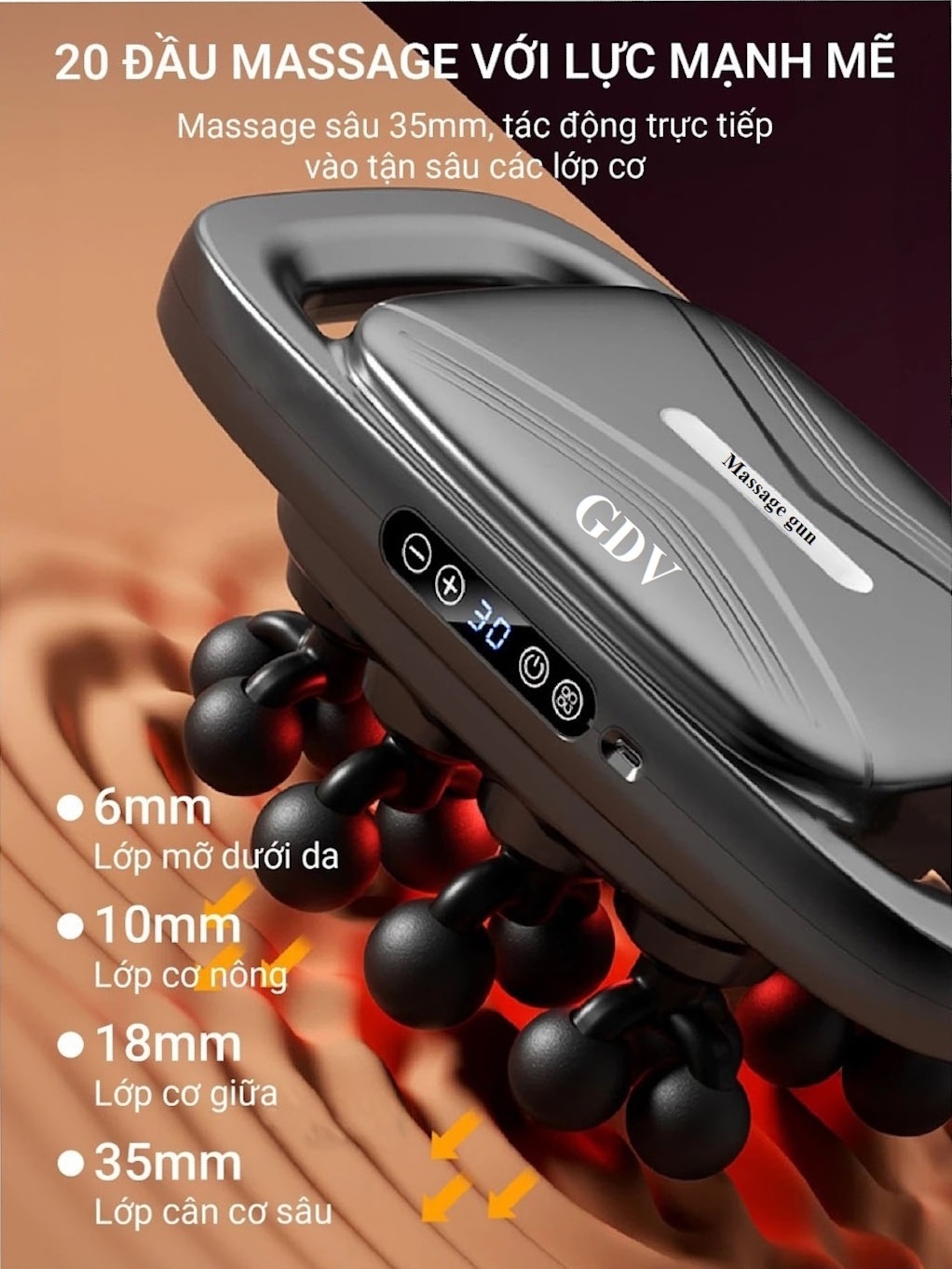 1.THÔNG TIN SẢN PHẨM: - Tên sản phẩm: Máy massage 20 đầu GDV S3C-20 - Kích thước sản phẩm: 17.5 x 14.4 x 35cm - Dung lượng pin: 2000mAh - Chức năng: 9 chế độ,