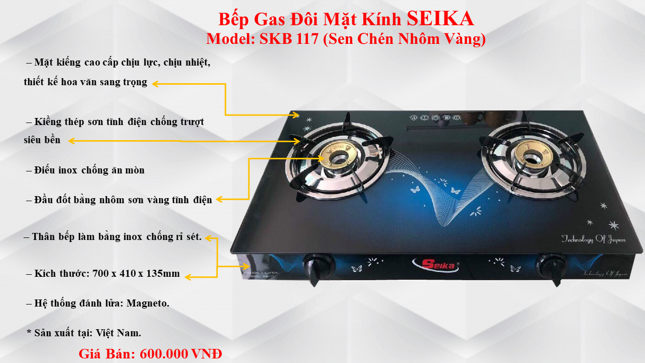 Bếp Gas Đôi Mặt Kính Seika ( Hồng Ngoại ) – Hàng Chính Hãng Model: SKB 217 – Mặt kiếng cao cấp chịu lực, chịu nhiệt, thiết kế hoa văn sang trọng – Thân bếp làm bằng inox chống rỉ sét. – Kiềng thép sơn tĩnh điện chống trượt siêu bền – Điếu inox chống ăn mòn – Đầu đốt bằng sứ cao cấp chống gió, chống nước – Kích thước: 700 x 410 x 135mm – Hệ thống đánh lửa: Magneto. * Sản xuất tại: Việt Nam. + Bếp Gas Đôi Mặt Kính Seika ( Hồng Ngoại) SKB217 – Hàng Chính Hãng có thiết kế nhỏ gọn, dễ dàng phù hợp với nhiều không gian bếp, ngoài ra với bề mặt kính luôn sáng bóng, dễ dàng vệ sinh sau khi sử dụng cùng họa tiết và màu sắc nổi bật. + Bếp SEIKA sẽ góp phần tiết kiệm gas, và tô điểm cho căn bếp nhà bạn thêm đẹp mắt và sang trọng.