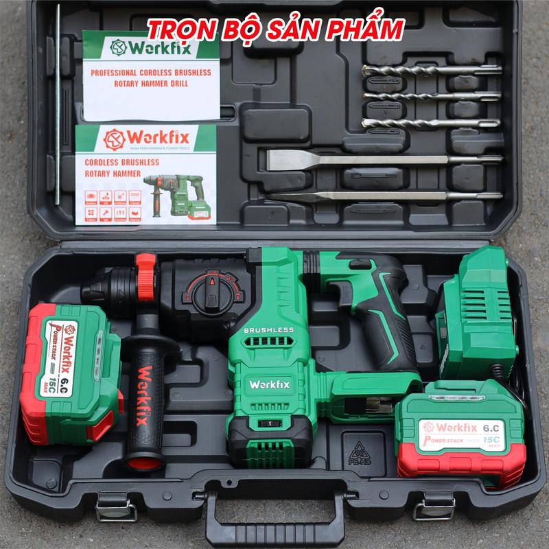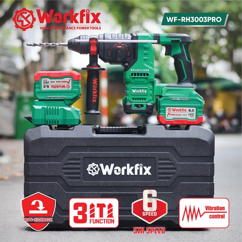 [Tặng Quạt Workfix 8 Inch + 1 Bộ Mũi Khoan Đục Bê Tông] Máy Khoan Đục Bê Tông 3 Chức Năng Dùng Pin 21V Workfix - WF-RH3003PRO - Có Anti-kickback, Giảm Rung RVT - 6 Tốc Độ - Chân Pin Phổ thông 2 Pin 21V/6Ah - Động Cơ Từ Lõi Đồng Chuyên Dùng Khoan Đục, Rút Lõi Công Trình