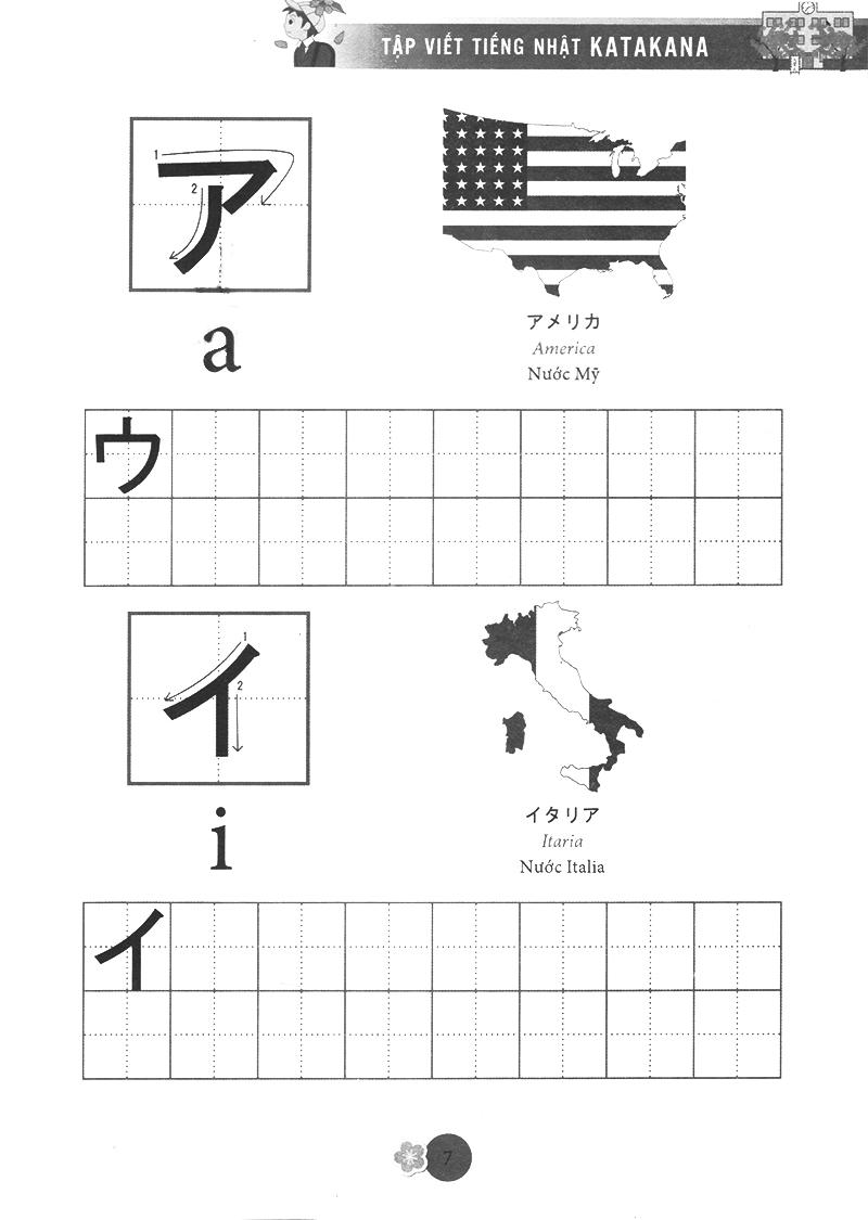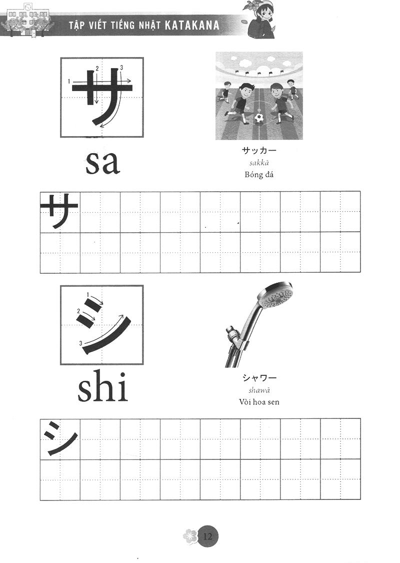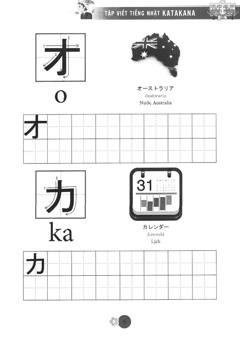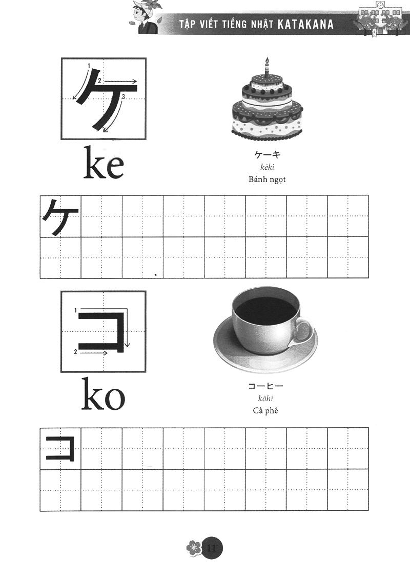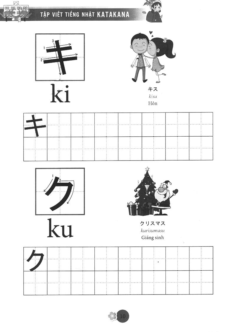 Katakana (chữ cứng) được dùng để phiên âm các từ mượn từ nước ngoài như tên quốc gia, tên người, động vật, thự vật… rất hay sử dụng trong cuộc sống và thường kết hợp với chữ kanji để câu có ý nghĩa, chúng được thành thừ các nét thẳng, cong và gấp khúc, ví dụ tên người là Tuệ được phiên âm thànhトゥエtwue. Bộ chữ katakana cũng rất quan trọng trong quá trình học tiếng nhật, bạn phải năm vững chắc 2 bộ chữ cái đơn giản này mới có thể học tiếng nhật tốt được. Chức năng của chữ kanji được sử dụng để nhấ mạnh các biển quảng cáo, các áp phích. Tập Viết Chữ Nhật được biên soạn theo giáo trình bản tiếng Anh của AOTS, giúp các bạn yêu thích tiếng Nhật có thể tự học và tập viết chữ Katakana của tiếng Nhật một cách dễ dàng. Đây là một cuốn sách bổ ích cho những ai đang bắt đầu học tiếng Nhật. Cuốn sách giúp bạn tập viết cho bộ chữ Katakana. Chữ trong cuốn sách đầy đủ, in đẹp và chính xác .