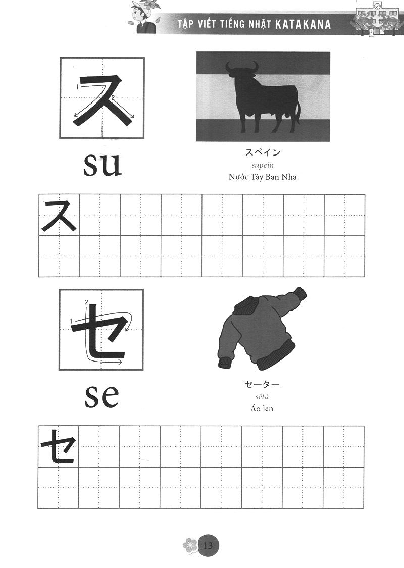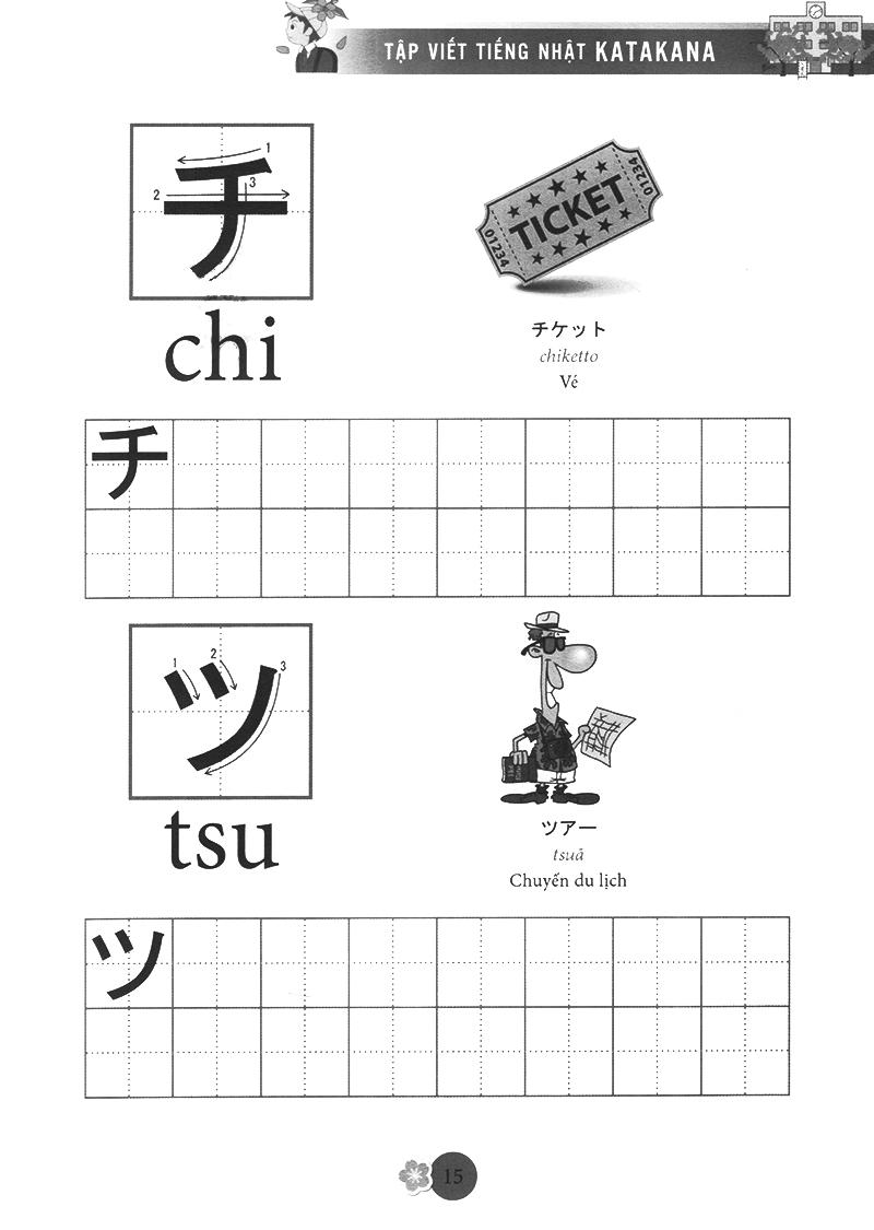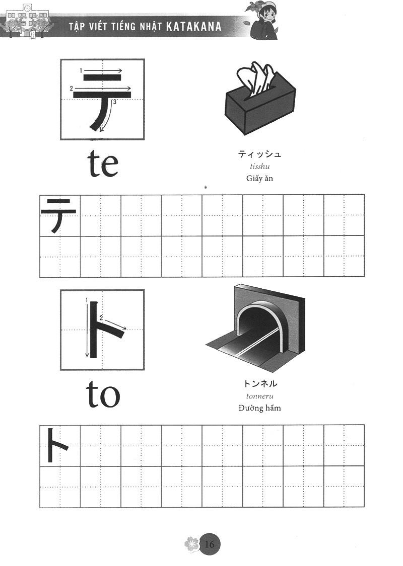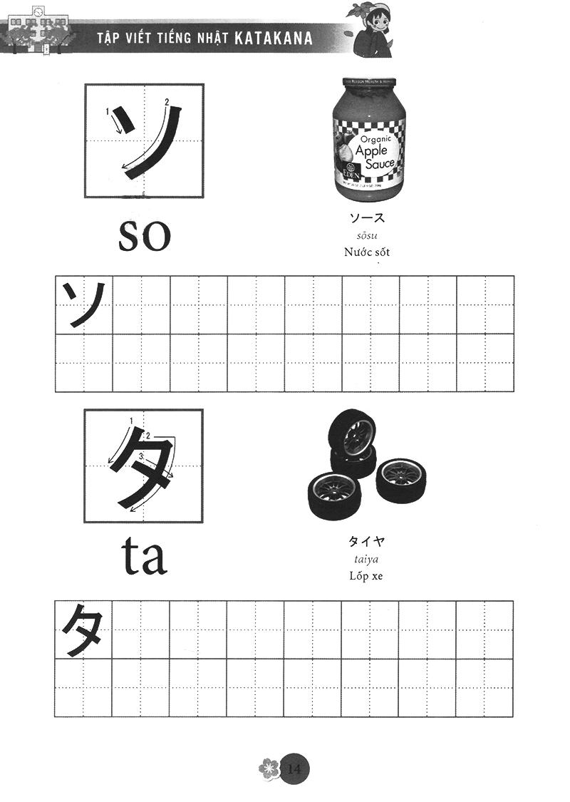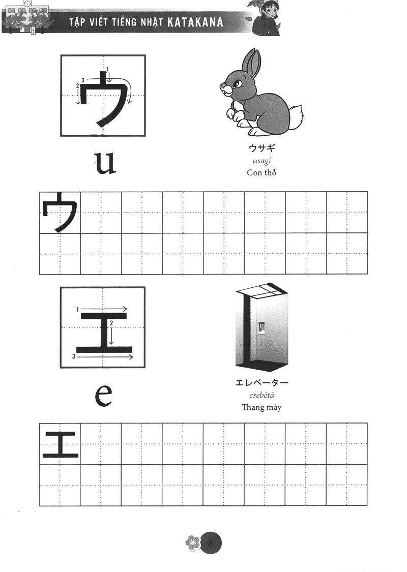 Katakana (chữ cứng) được dùng để phiên âm các từ mượn từ nước ngoài như tên quốc gia, tên người, động vật, thự vật… rất hay sử dụng trong cuộc sống và thường kết hợp với chữ kanji để câu có ý nghĩa, chúng được thành thừ các nét thẳng, cong và gấp khúc, ví dụ tên người là Tuệ được phiên âm thànhトゥエtwue. Bộ chữ katakana cũng rất quan trọng trong quá trình học tiếng nhật, bạn phải năm vững chắc 2 bộ chữ cái đơn giản này mới có thể học tiếng nhật tốt được. Chức năng của chữ kanji được sử dụng để nhấ mạnh các biển quảng cáo, các áp phích. Tập Viết Chữ Nhật được biên soạn theo giáo trình bản tiếng Anh của AOTS, giúp các bạn yêu thích tiếng Nhật có thể tự học và tập viết chữ Katakana của tiếng Nhật một cách dễ dàng. Đây là một cuốn sách bổ ích cho những ai đang bắt đầu học tiếng Nhật. Cuốn sách giúp bạn tập viết cho bộ chữ Katakana. Chữ trong cuốn sách đầy đủ, in đẹp và chính xác .