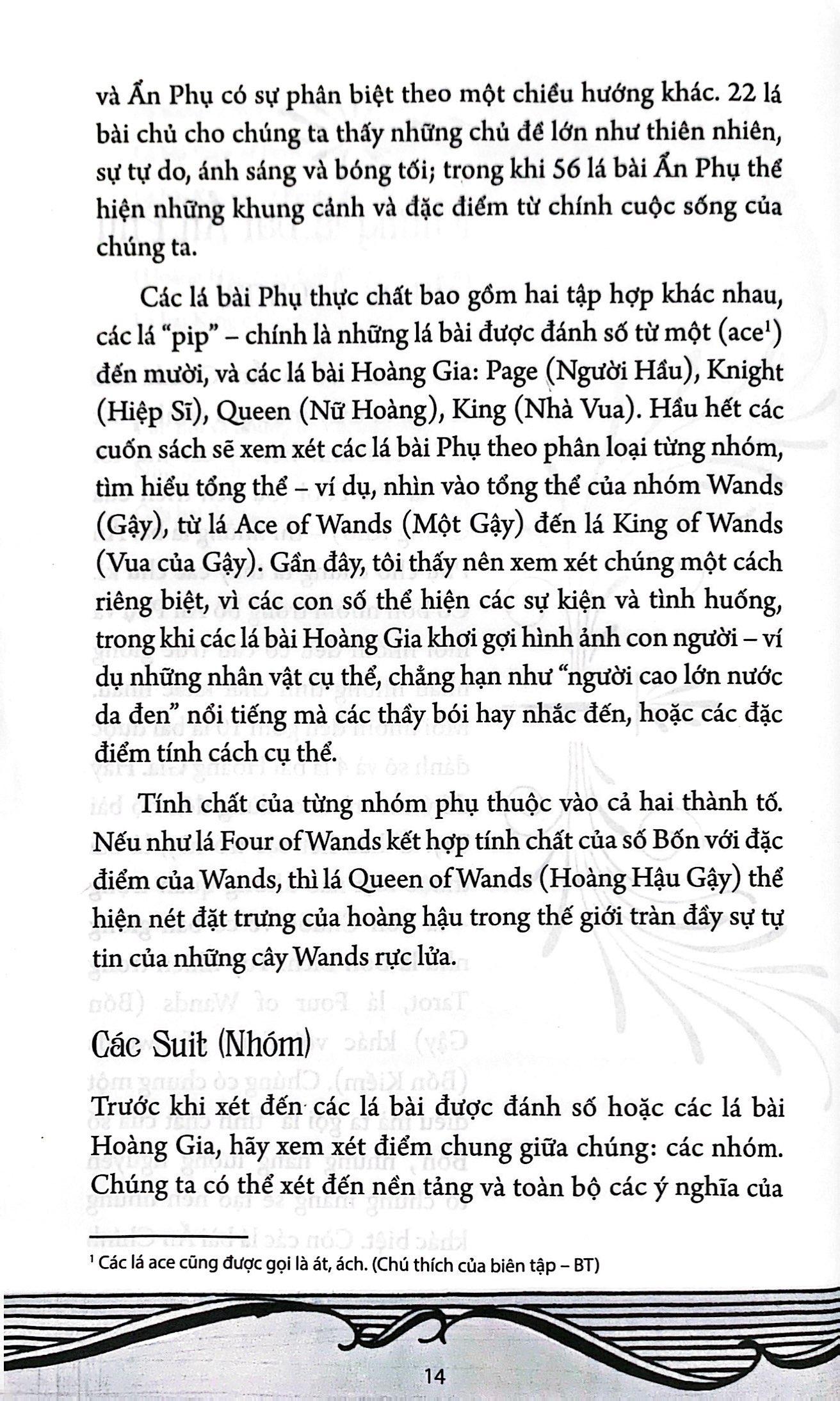trúc giống nhau nhưng tính chất khác nhau. Mỗi nhóm đều gồm 10 lá bài được đánh số và 4 lá bài Hoàng Gia. Hãy để ý các trò chơi dùng đến bộ bài Tây. Ở hầu hết các trò này, lá bài thuộc loại nào không quan trọng – lá Bốn Chuồn về cơ bản giống như lá Bốn Bích. Tuy nhiên trong Tarot, lá Four of Wands (Bốn Gậy) khác với Four of Swords (Bốn Kiếm). Chúng có chung một điều mà ta gọi là “tính chất của số Bốn”, nhưng năng lượng nguyên tố chúng mang sẽ tạo nên những khác biệt. Còn các lá bài Ẩn Chính và Ẩn Phụ có sự phân biệt theo một chiều hướng khác. 22 lá bài chủ cho chúng ta thấy những chủ đề lớn như thiên nhiên, sự tự do, ánh sáng và bóng tối; trong khi 56 lá bài Ẩn Phụ thể hiện những khung cảnh và đặc điểm từ chính cuộc sống của chúng ta