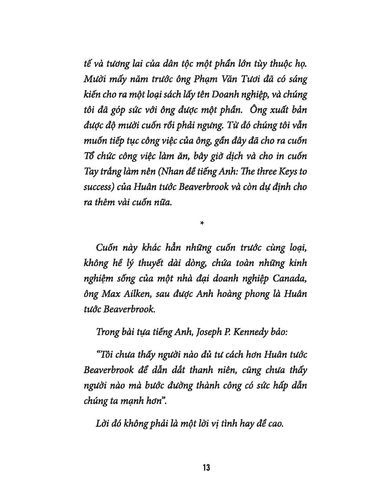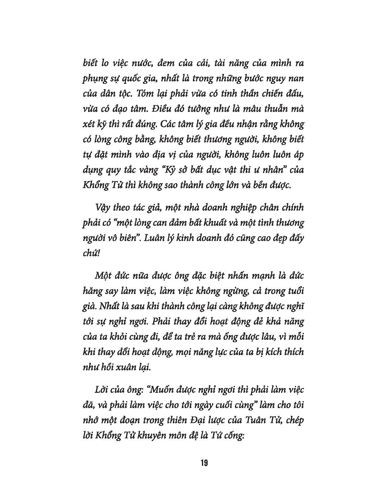 Nhưng nếu làm giàu một cách lương thiện như tác giả, để tôi luyện khả năng, tư cách của mình vì trường kinh doanh là nơi đào tạo những con người biết nhận xét, phán đoán, quyết định, kiên nhẫn làm việc và chiến đấu và để cho quốc gia thịnh vượng lên, thì trong hiện tình nước ta, nó là bổn phận của mỗi công dân. Như trên đã nói, nước ta không sao mở mặt được với đời nếu kinh tế không phát triển và mọi ngành kinh doanh đều ở trong tay ngoại nhân cả. Vậy ta phải đánh đổ quan niệm cổ "vi phú bất nhân" đi. Nó có cái đẹp của nó, nhưng nó không hợp với hoàn cảnh lúc này nữa.