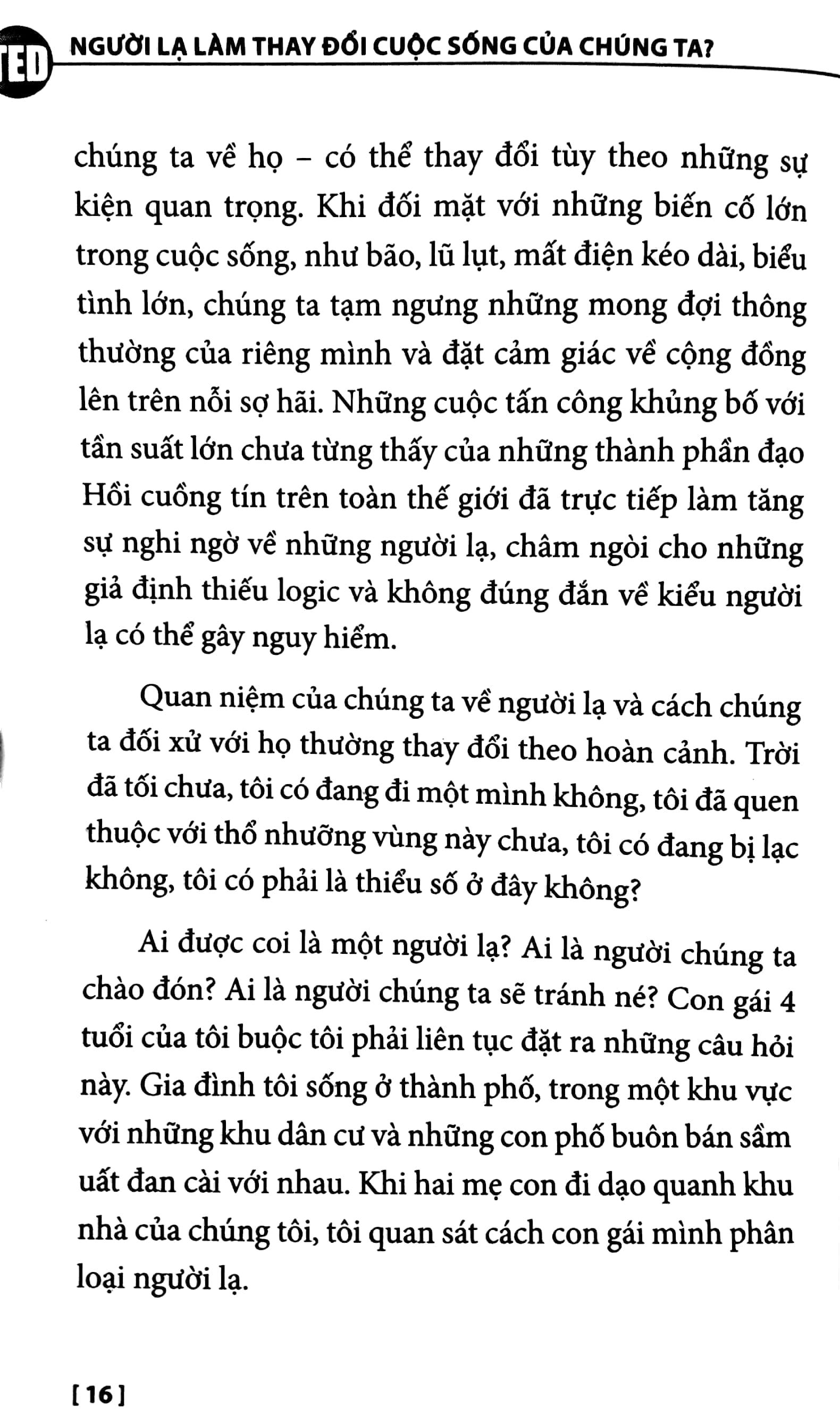 Đây là cuốn sách về trò chuyện, và nó cũng là cuốn sách về cách nhìn nhận, lắng nghe và nhắc nhở về thế giới. Có những mối liên hệ chỉ trong giây lát lại có thể nên thơ và sâu sắc như thế nào để bạn mở rộng tầm hiểu biết của mình và làm phong phú thêm những khái niệm về con người – những người lạ với bạn. Và cuốn sách cũng cho thấy động cơ ẩn chứa và ý nghĩa của những tương tác trên phố. Bạn sẽ tìm thấy một cách mới để yêu thêm thế giới này.