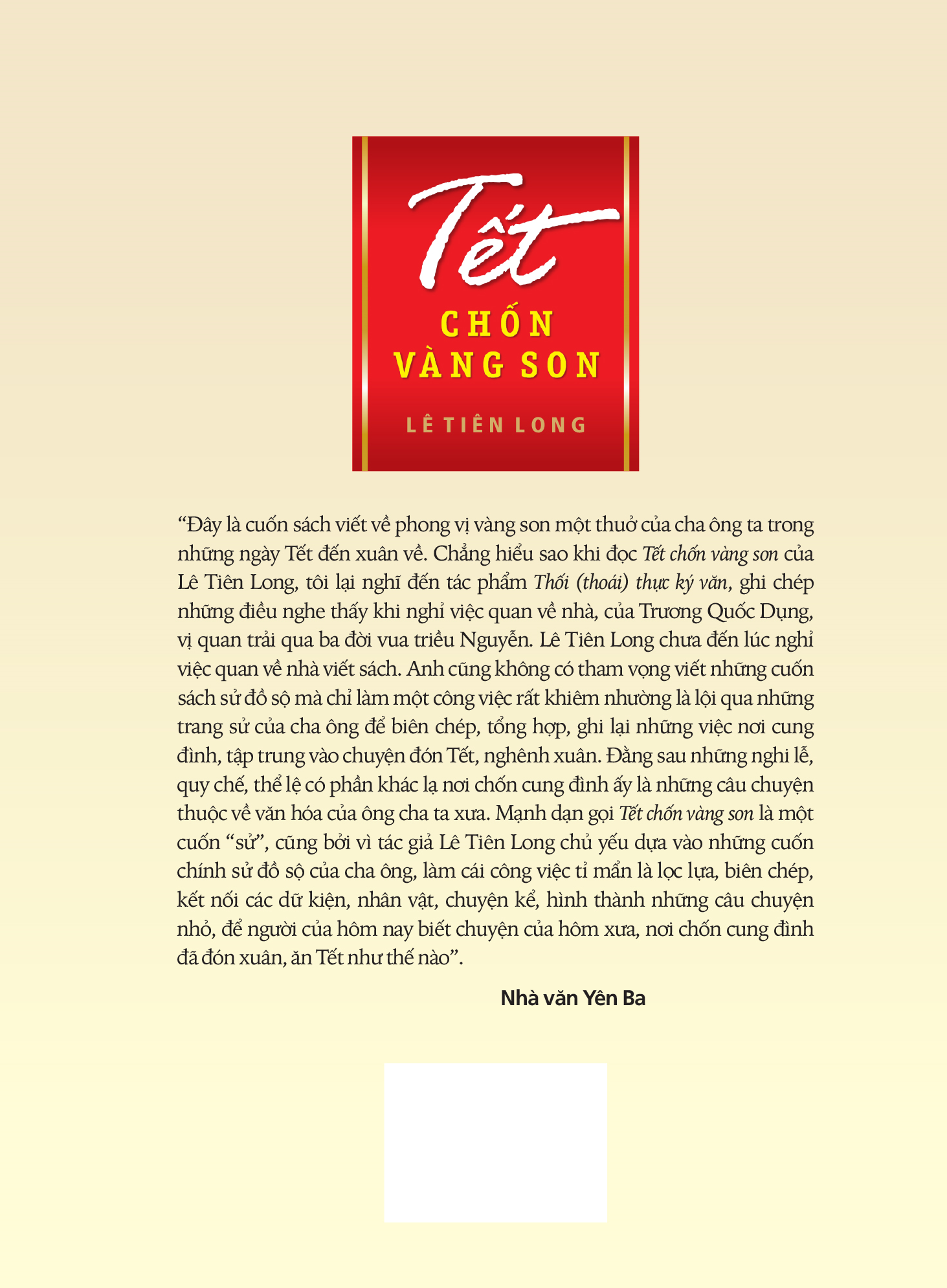 Đây là cuốn sách viết về phong vị vàng son một thuở của cha ông ta trong những ngày Tết đến xuân về. Tác giả Lê Tiên Long chủ yếu dựa vào những cuốn sách chính sử đồ sộ của cha ông, làm cái công việc tỉ mẩn là lọc lựa, biên chép, kết nối các sự kiện, nhân vật, chuyện kể, hình thành những câu chuyện nhỏ, để người của hôm nay biết chuyện của hôm xưa, nơi chốn cung đình đã đón xuân, ăn Tết như thế nào. Chỉ có điều nó không phải một cuốn sử theo nghĩa thông thường, mà mang cái phong vị dân dã, khiêm cung, dẫu viết chủ yếu về những nghi lễ rắc rối phức tạp ở nơi chốn uy nghiêm, sang trọng bậc nhất trong thời kỳ phong kiến là cung đình!
