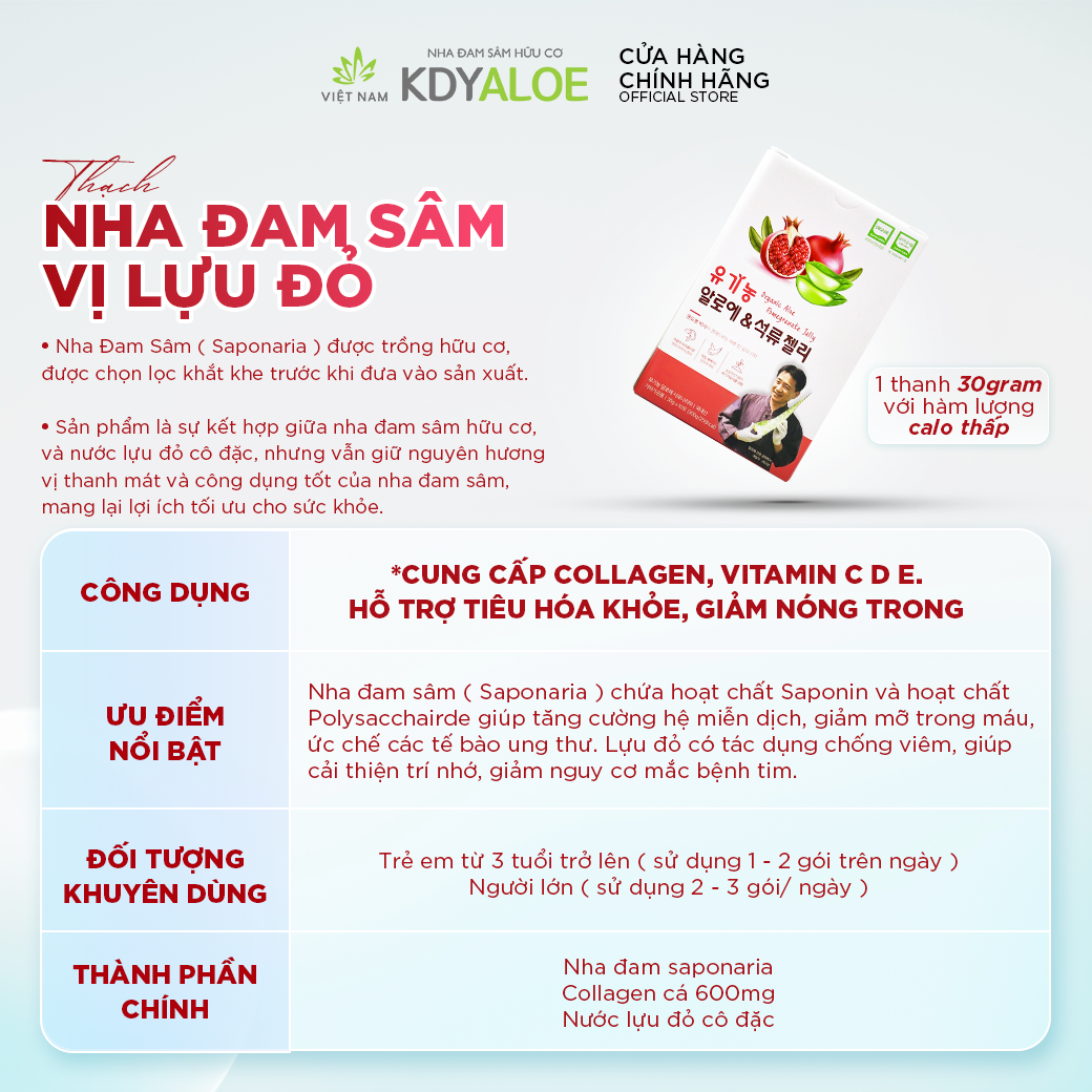 THẠCH COLLAGEN KDY ALOE NHA ĐAM SÂM LỰU ĐỎ LÀM ĐẸP DANha đam sâm chứa hoạt chất Polysaccharide, Saponin giúp Tăng miễn dịch, Hỗ trợ tiêu hóa, Giúp nhuận tràng, Giảm táo bón .Lựu cô đặc giàu chất chố...
