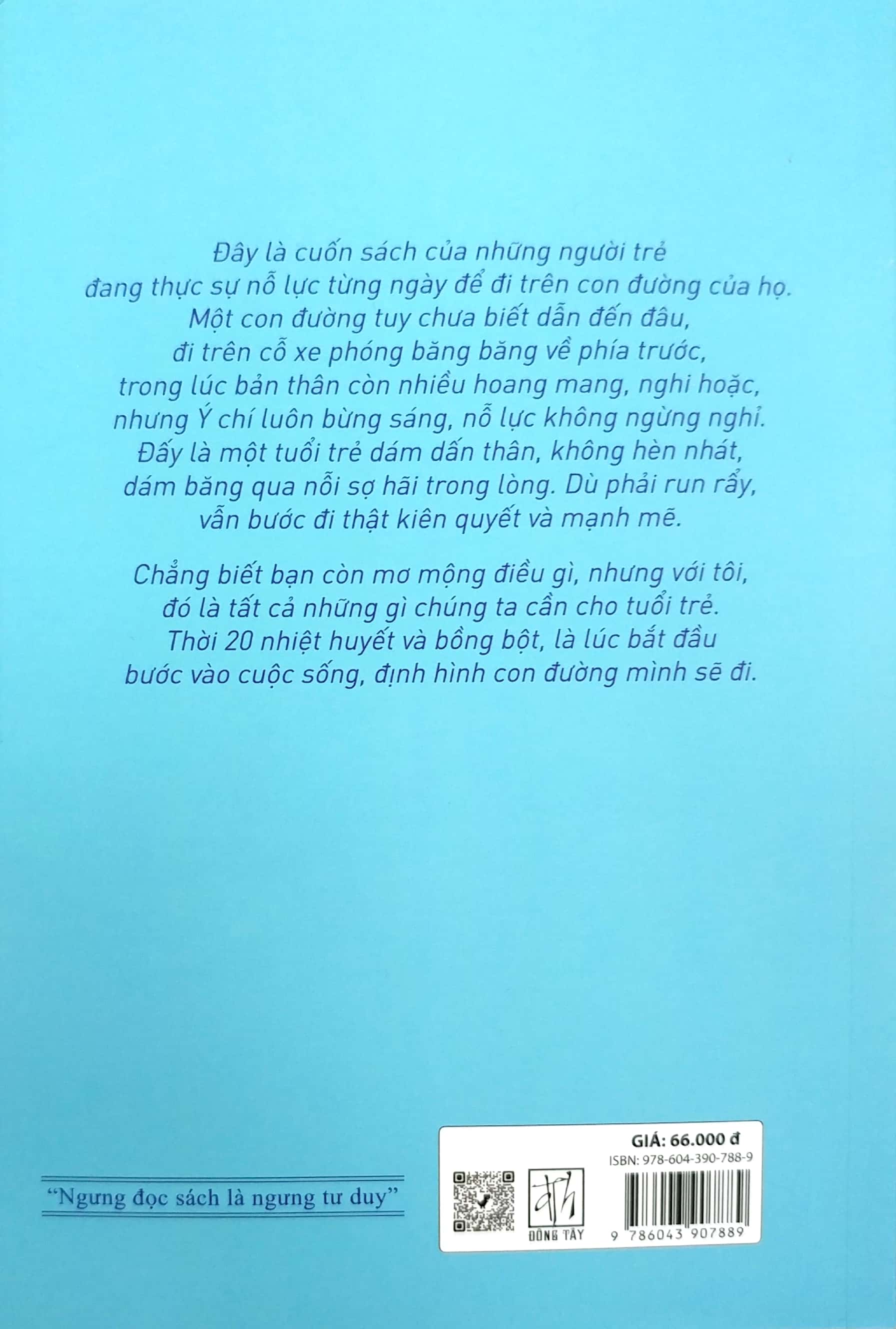 Đây là cuốn sách của những người trẻ đang thực sự nỗ lực từng ngày để đi trên con đường của họ. Một con đường tuy chưa biết dẫn đến đâu, đi trên cỗ xe phóng băng băng về phía trước, trong lúc bản thân còn nhiều hoang mang, nghi hoặc, nhưng Ý chí luôn bừng sáng, nỗ lực không ngừng nghỉ. Đấy là một tuổi trẻ dám dấn thân, không hèn nhát, dám băng qua nỗi sợ hãi trong lòng. Dù phải run rẩy, vẫn bước đi thật kiên quyết và mạnh mẽ.
